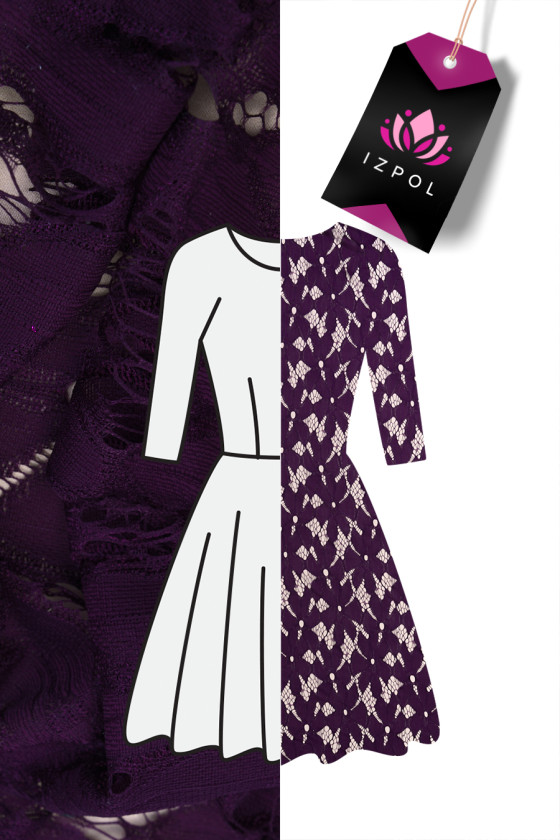 Olasz csipke szövet sötét lila színben. Nagyon érdekes, 14 cm átmérőjű virágok motívuma, amelyet egy kis pókháló köt össze. A korona nagyon puha tapintású, enyhén rugalmas, és nem dekoratív foggal készül. Gyönyörű javaslat elegáns ruha, blúz varrására vagy más szövetek kiegészítésére.