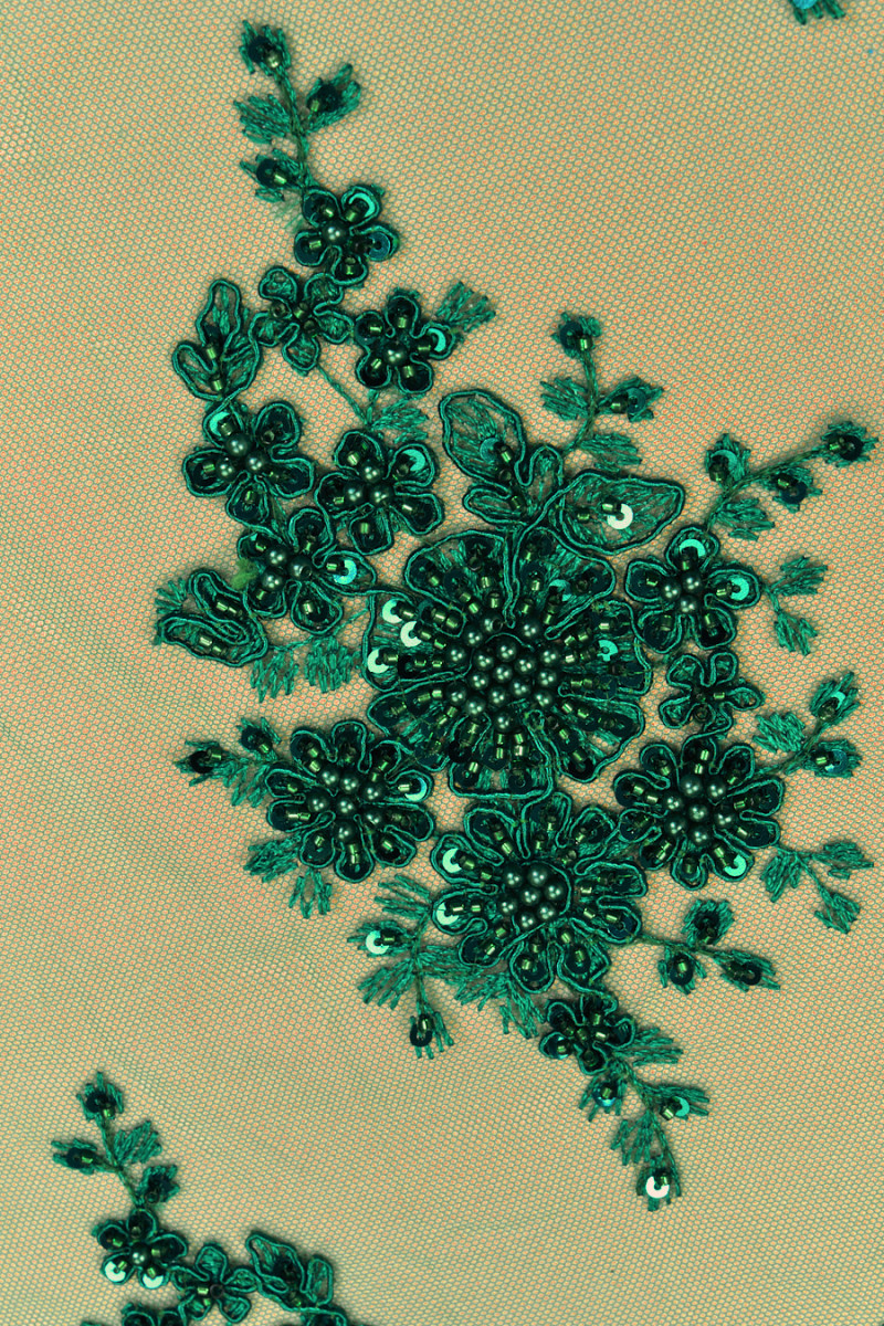 Olasz csipke esti szövet sötétzöldben, azonos színű tüllből, egyenletesen hímzett virágmotívumokkal, 10 cm*20 cm méretű. Gazdagon díszített zöld flitterekkel, gyöngyökkel és gyöngyökkel, és zöld zsinórral van díszítve, amely kissé domborúvá teszi a mintát. A szövet szélei széles, dekoratív fogakkal készülnek - körkörösen varrjuk.