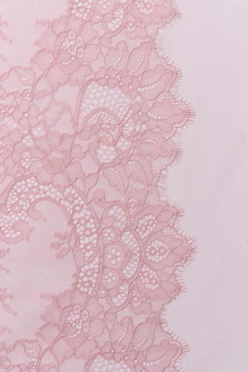 Olasz, finom francia csipke piszkos rózsaszínben. A korona puha, átlátszó, kellemes tapintású, mindkét oldalán dekoratív fogakkal van ellátva, rugalmatlan, de óvatosan dolgozik a fogselyemen és szépen illeszkedik. Blúzokhoz, betétekhez, elegáns fehérneműkhöz ajánljuk.