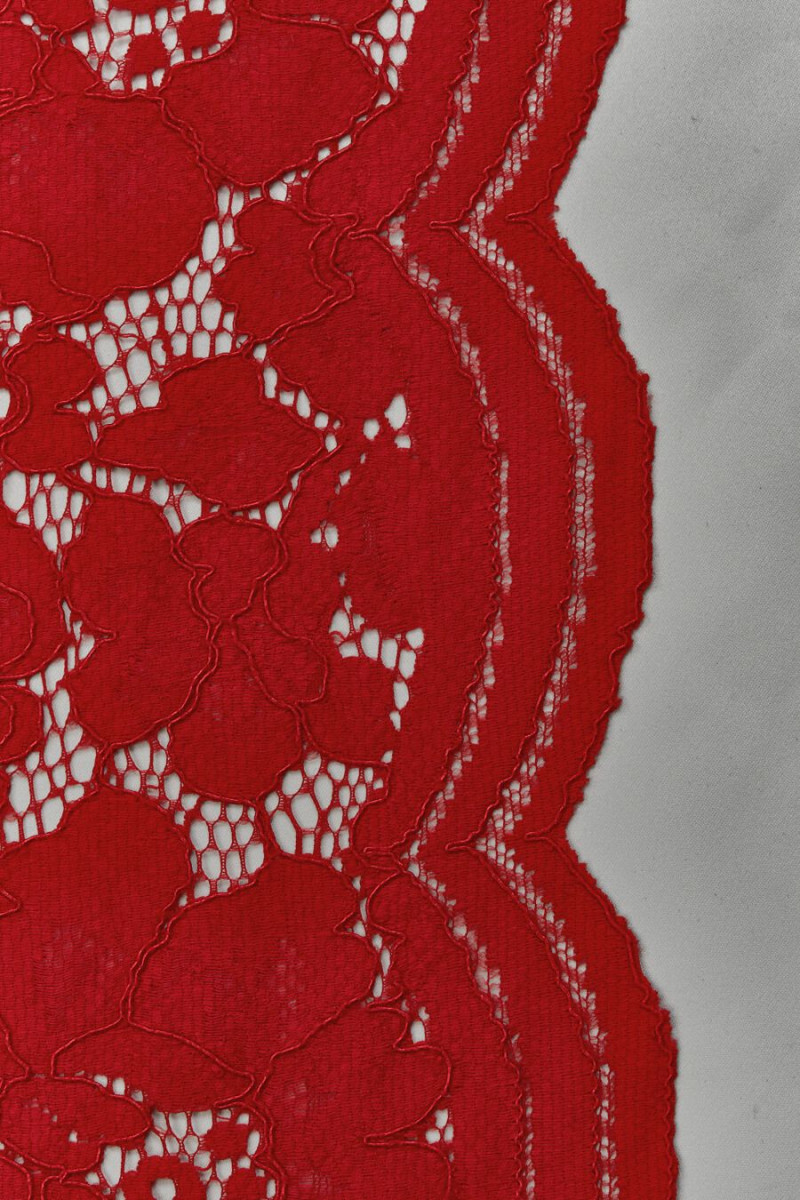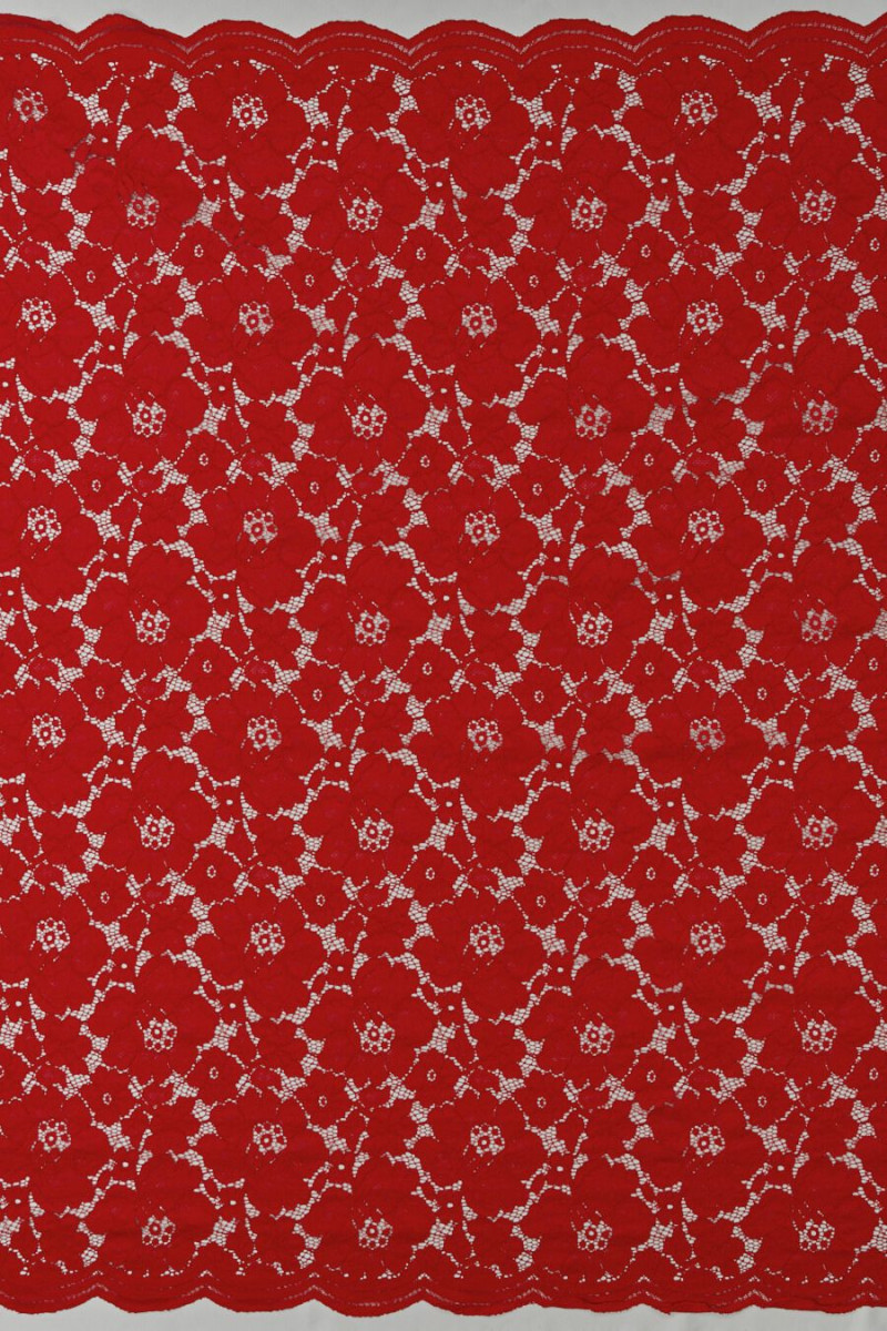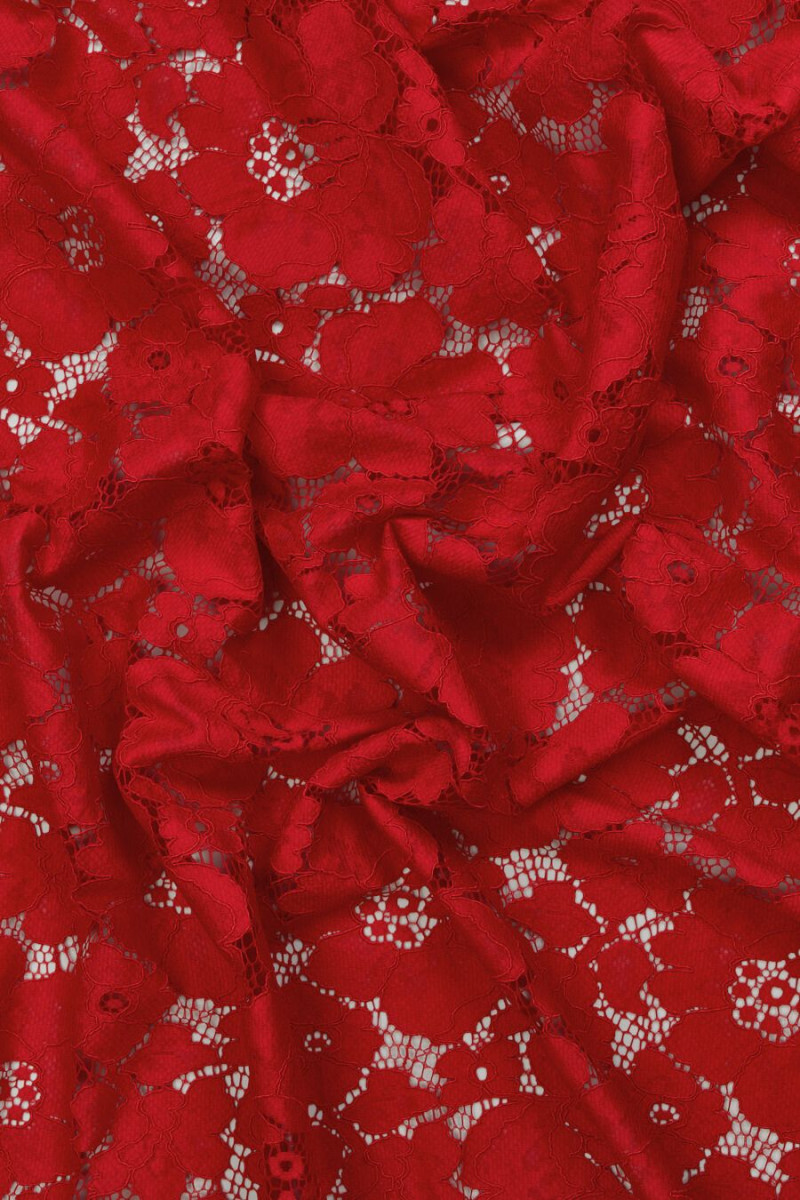 Olasz csipke, meglehetősen nagy virágok motívumával, piros. Sűrű, virágos minta, amely két dimenziós virágokból áll: a nagy virág 14 cm * 14,5 cm méretű, a kicsi pedig 6 cm * 6,5 cm. A szövet puha, nem rugalmas, matt és mindkét oldalán dekoratív fogakkal van ellátva. Érdekes ajánlat azok számára, akik szeretik a klasszikus, erős színeket. Tökéletes formális ruhákhoz, valamint mindennapi ruhákhoz.