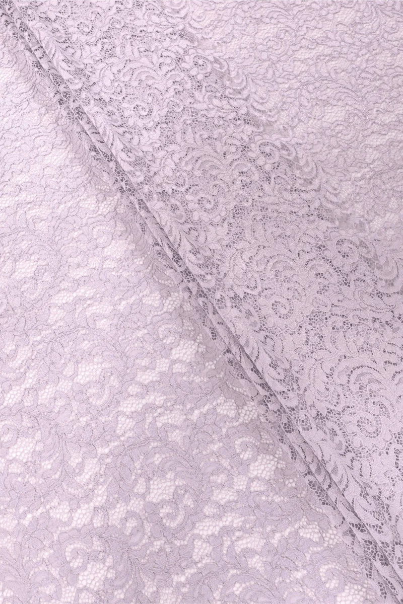 Olasz csipke világos lila színben. Az anyag sűrű virágos motívumot tartalmaz, hálóval összekapcsolva, és fűzővel zárul. A koronát mindkét oldalon díszítő fogas díszítő – kerületben varrjuk. Puha, átlátszó és hajlíthatatlan. Nagyon szép ötlet semleges színben, amelyből ruhákat, szoknyákat, blúzokat vagy ünnepi rövidnadrágokat lehet készíteni.
