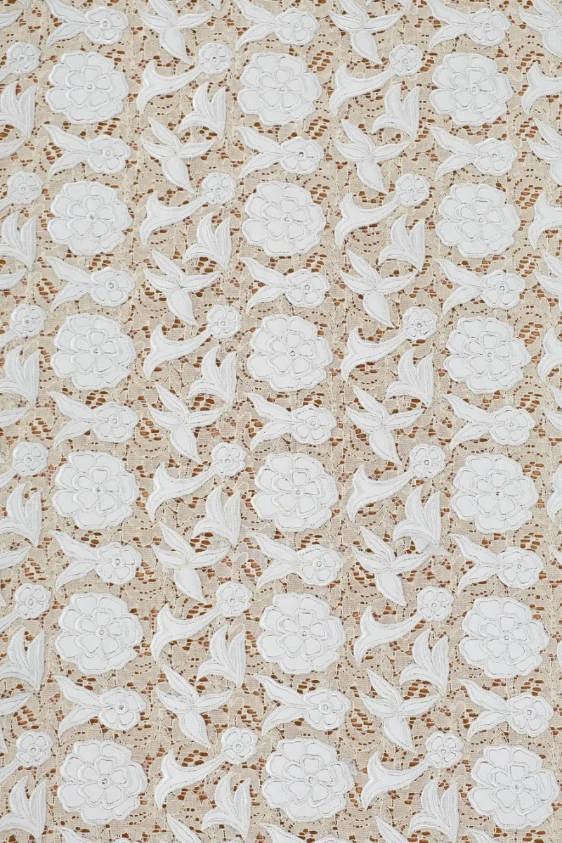 A krém (világos bézs) csipkén fehér öko-bőrből készült varrott virágok vannak. Ruhákhoz, blúzokhoz és szoknyákhoz szánt szövet. Nem rugalmas anyag.