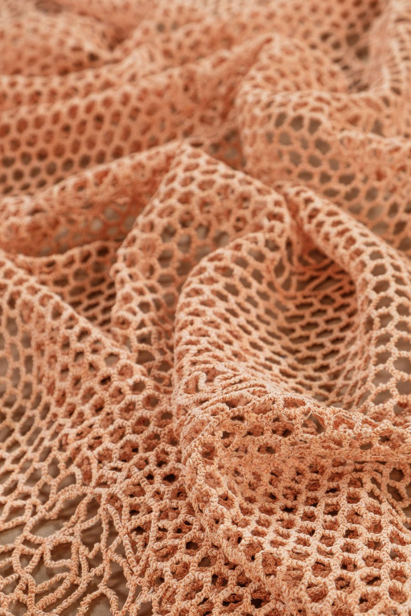 Guipure csipke hálós szerkezettel narancssárga lazacban. Tökéletes áttört ruhákhoz vagy blúzokhoz.