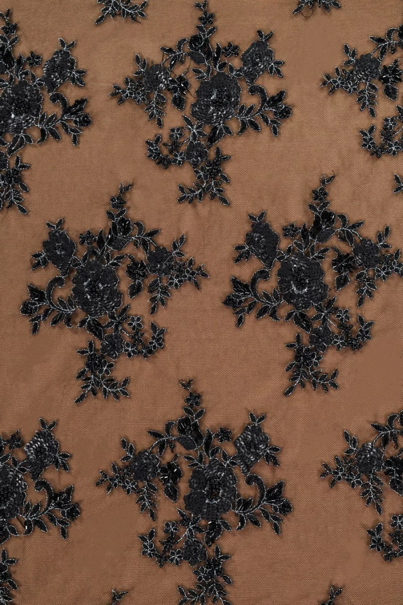 Gyönyörű fekete csipke flitterekkel és gyöngyökkel hímezve, ezüst lurex szállal díszítve. Mindkét oldalon foggal készült. Tökéletes estélyi ruhához.