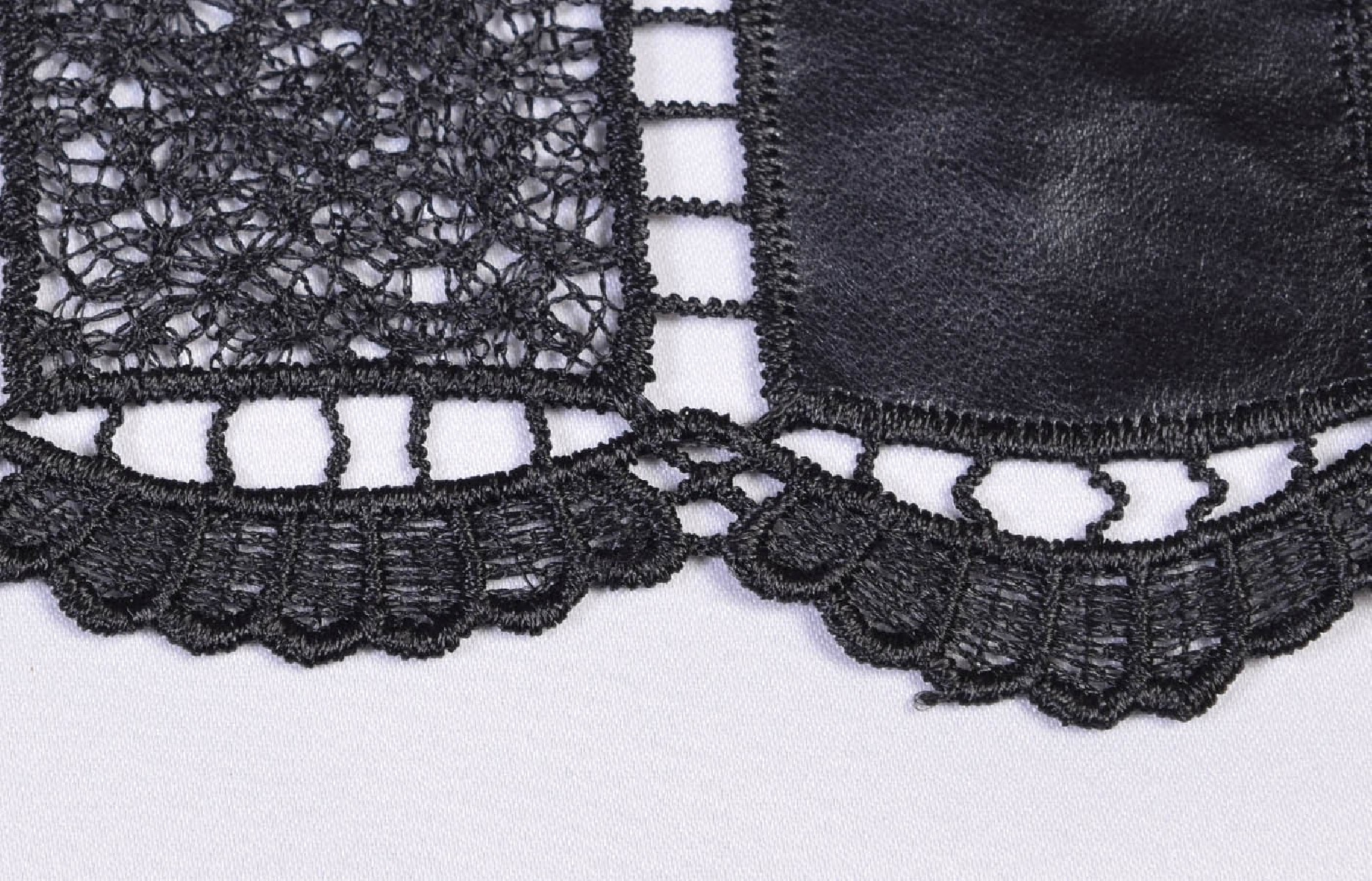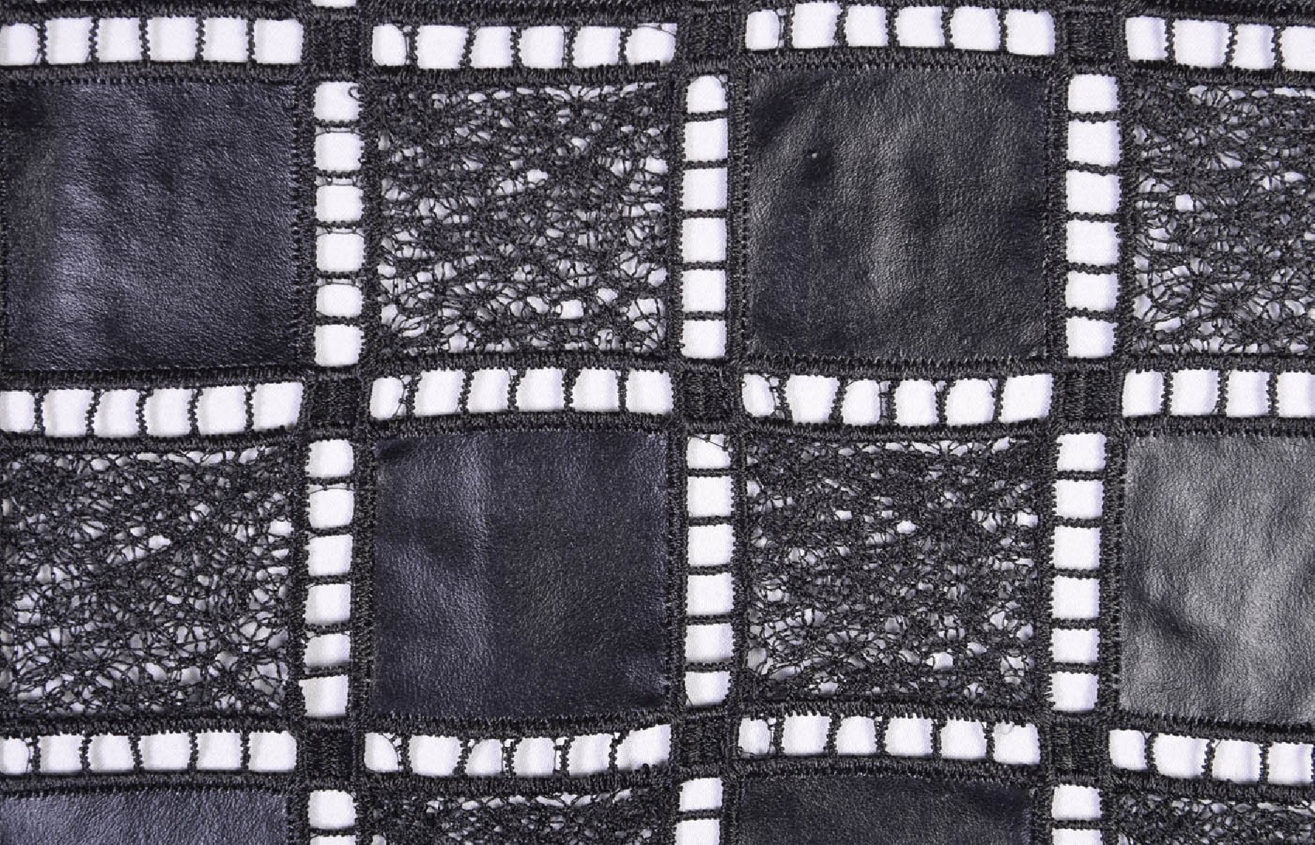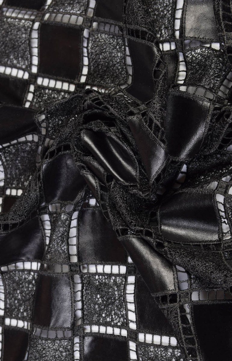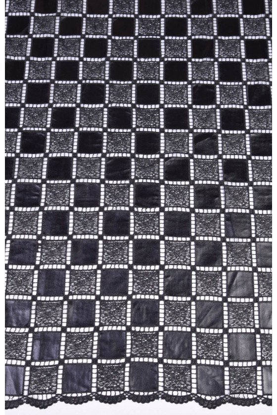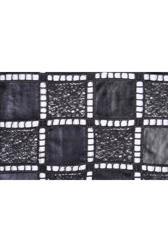 A csipkét öko-bőrrel kombinálják. Sakktábla minta. Mindkét oldalon foggal készült. A szövet nagyon fenomenális.
