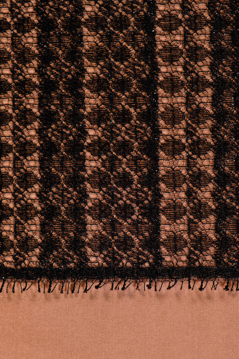 Gyönyörű francia csipke fekete színben, fényes lurex szállal. A függőleges csíkok sűrű motívuma - a csipkének nincs dekoratív foga. A szövet 88 cm széles.