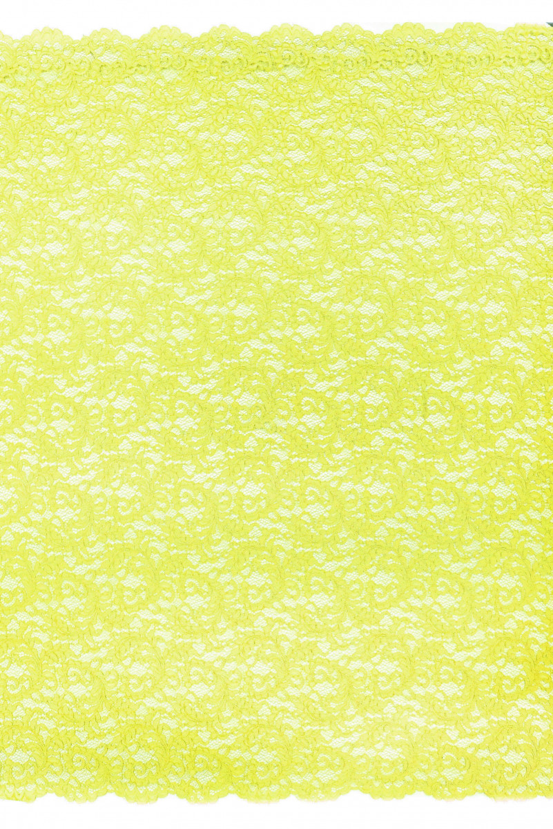 Olasz lime zöld csipke sűrű virágmotívummal. A szövet puha, nem rugalmas, mindkét oldalán dekoratív fogakkal van ellátva.