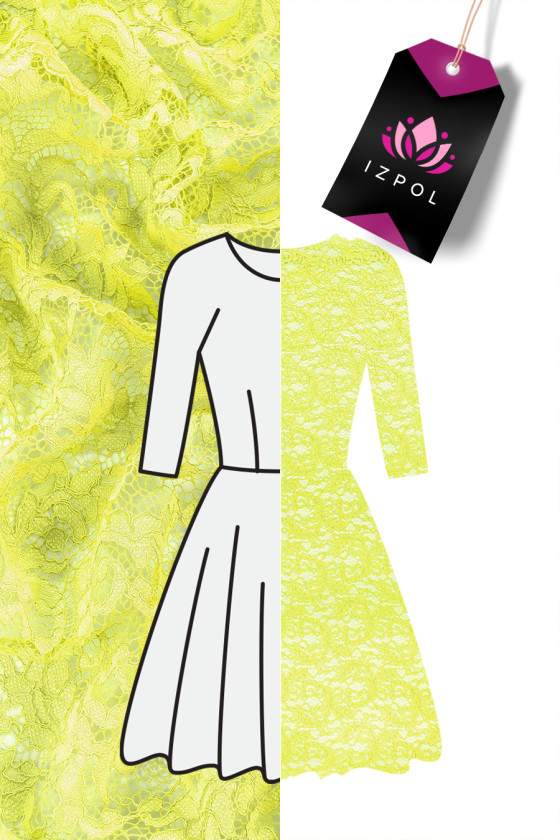 Olasz lime zöld csipke sűrű virágmotívummal. A szövet puha, nem rugalmas, mindkét oldalán dekoratív fogakkal van ellátva. Tökéletes ajánlat ruha, szoknya vagy blúz varrásához.