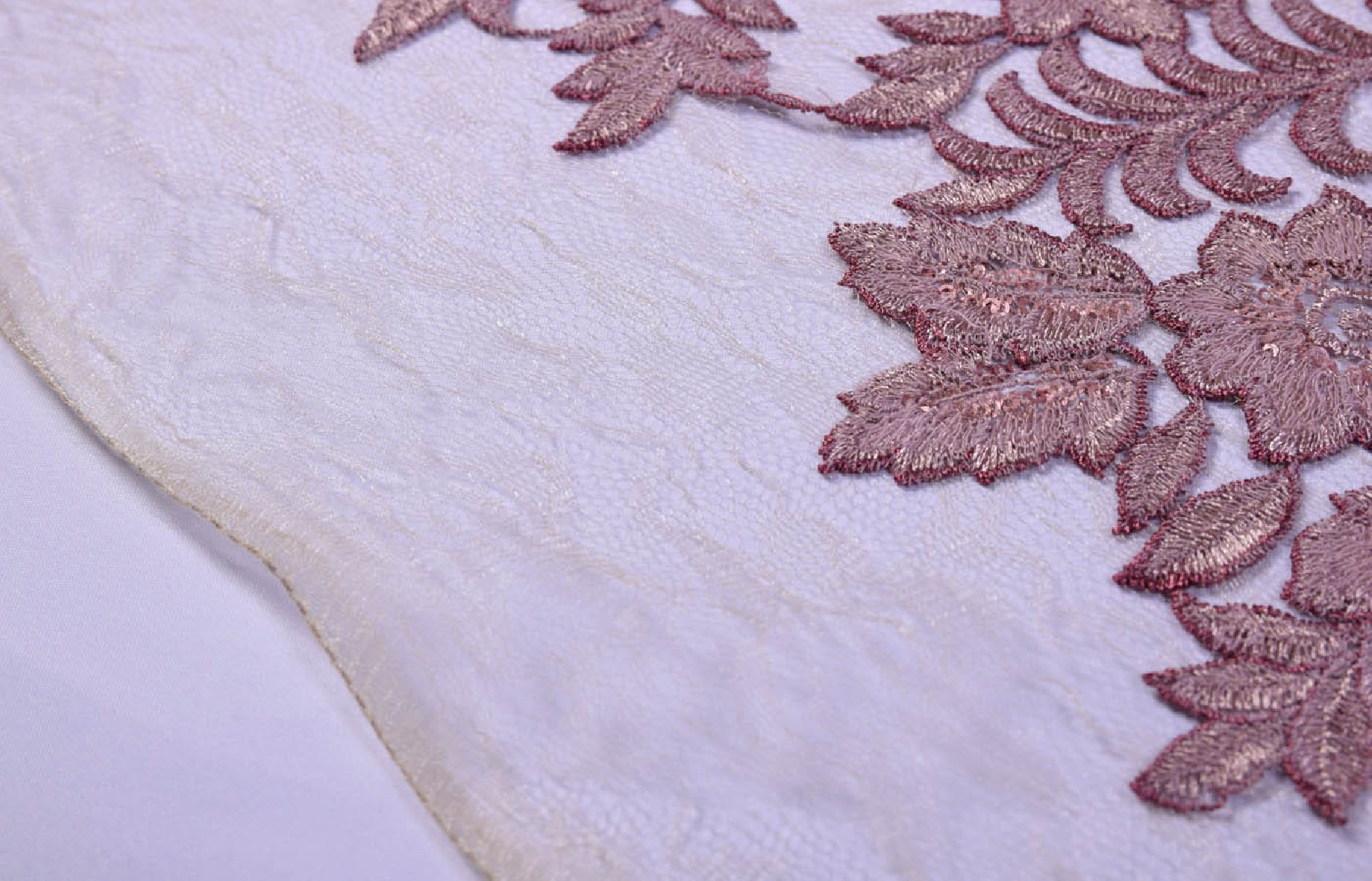 | szín: | Háló: pezsgő, hímzés és flitterek: púderrózsaszín, piszkos rózsaszín |
