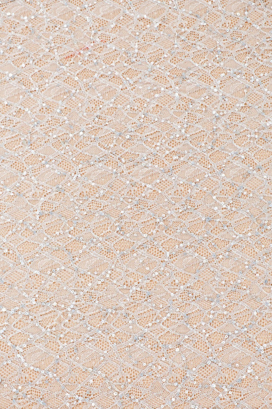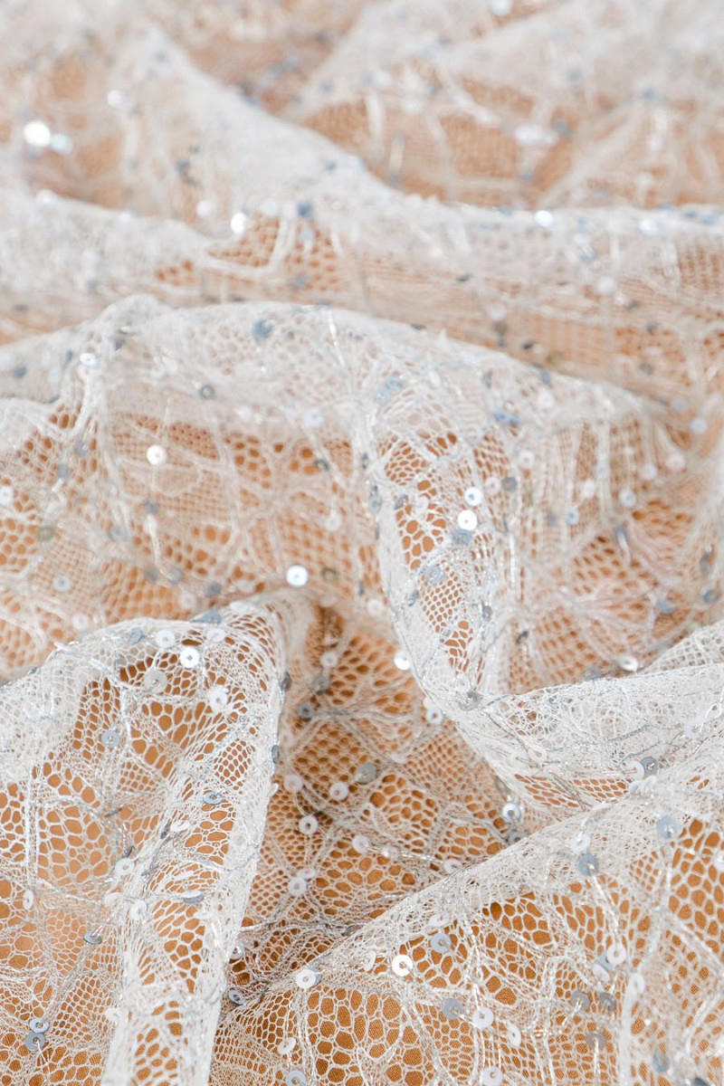 Vékony, finom csipke szürke-ezüst - hímzett kis többszínű flitterekkel és ezüst lurex szállal. A szövet mindkét oldalán fogakkal van ellátva. Tökéletes ruhákhoz vagy blúzokhoz