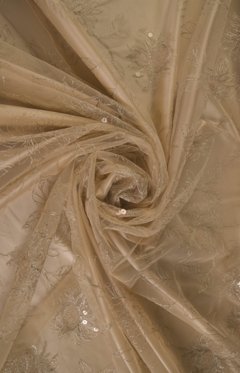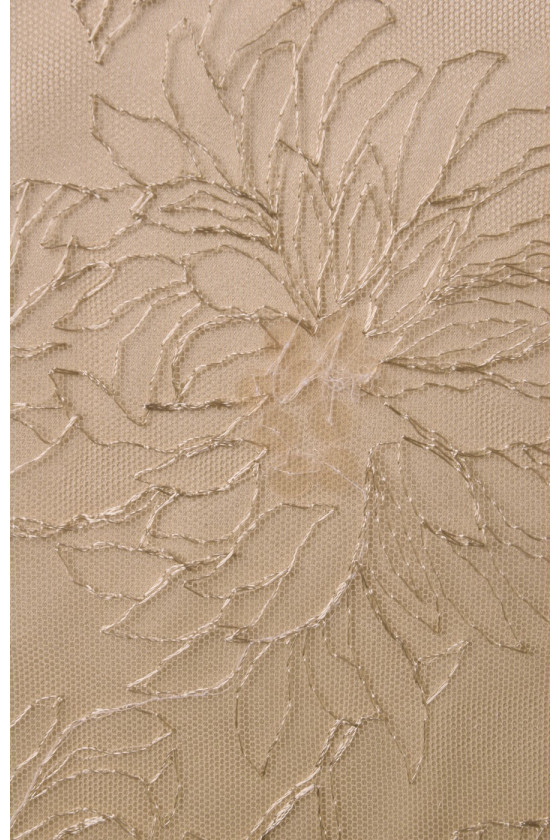 Bézs csipke hímzett finom mintával, nagy virágokkal, amelyekhez átlátszó flittereket varrnak, aminek köszönhetően a szövet diszkréten csillog. A szerkezet mérsékelten merev. Javasoljuk, hogy bélésként válasszon szatént.