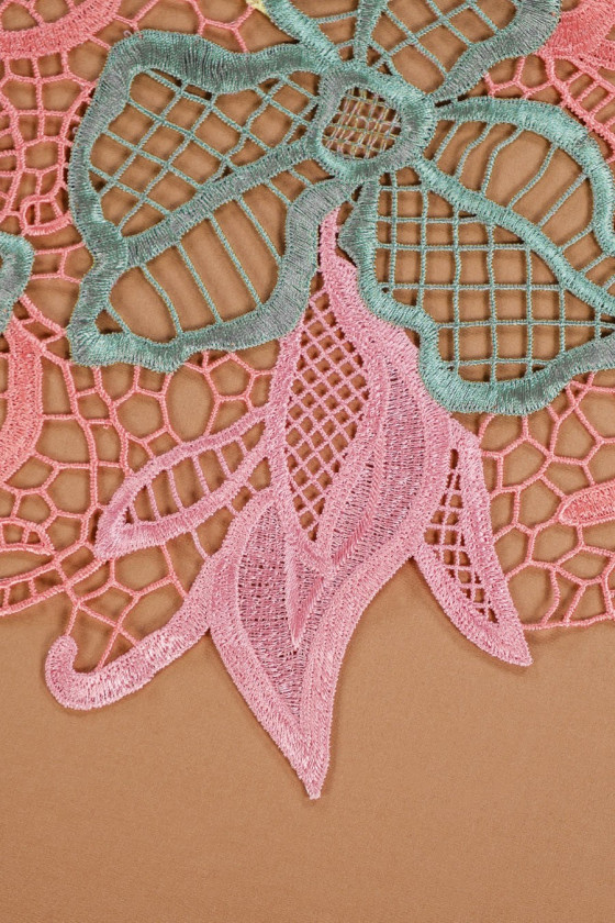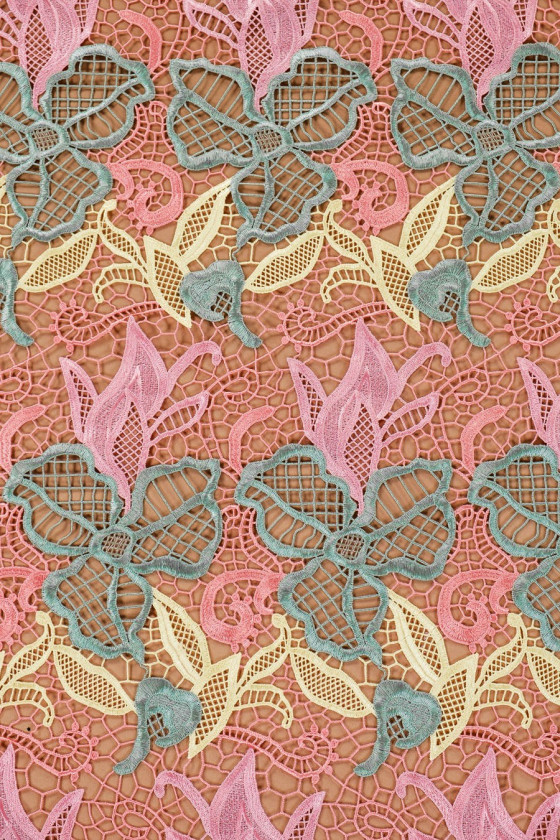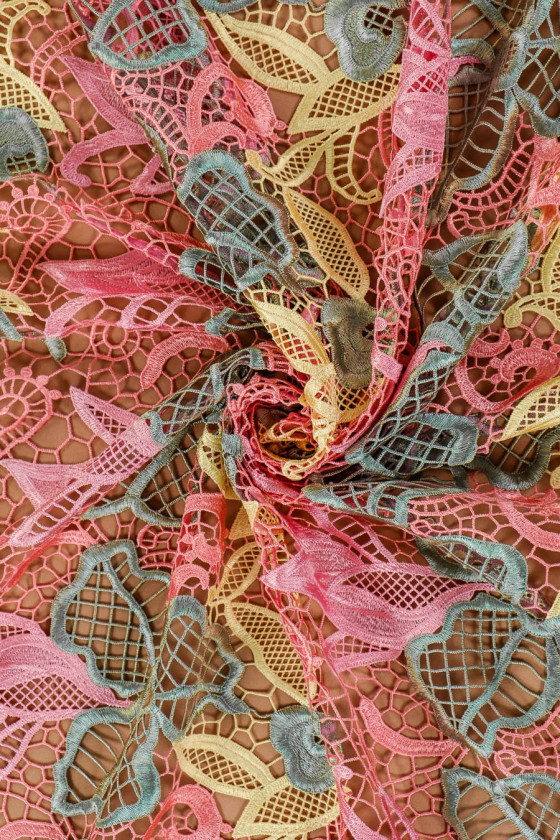 Olasz guipure csipke pasztell színekben, közepes vastagságban. Ruhákhoz vagy szoknyákhoz ajánljuk.