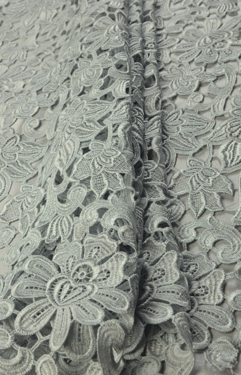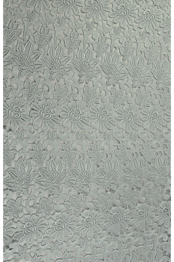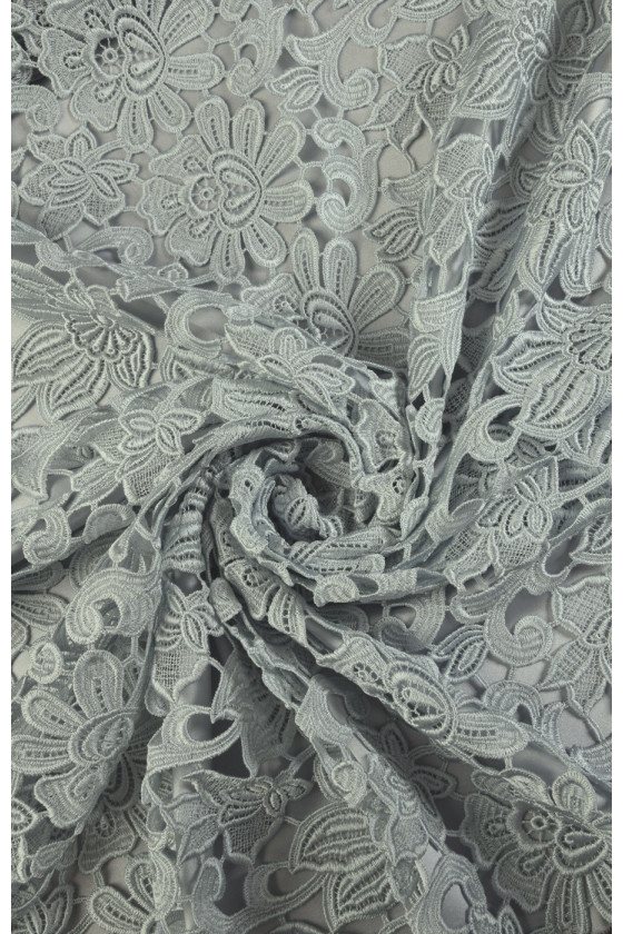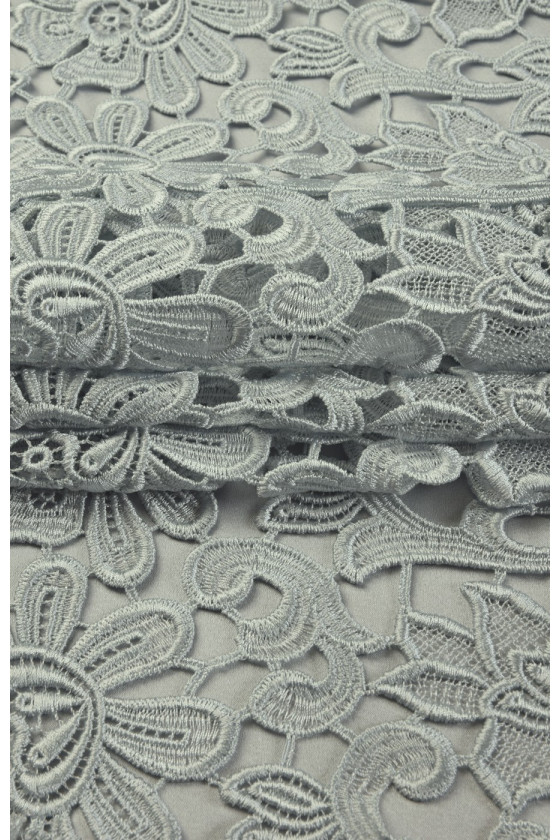 Guipure csipke ezüstös-szürke színű, viszkóz és poliamid szálakból szőtt. A szép hatás érdekében javasoljuk, hogy válasszon bélést, pl. selyemszaténból.