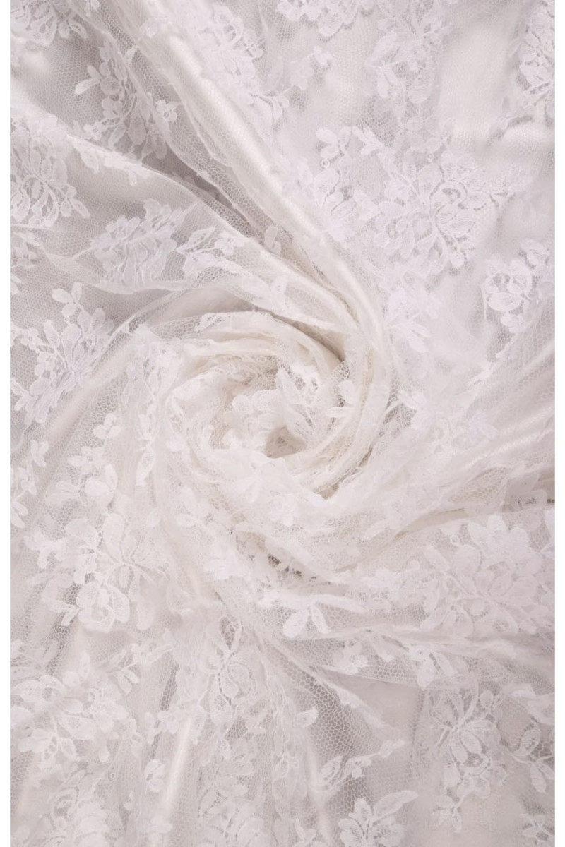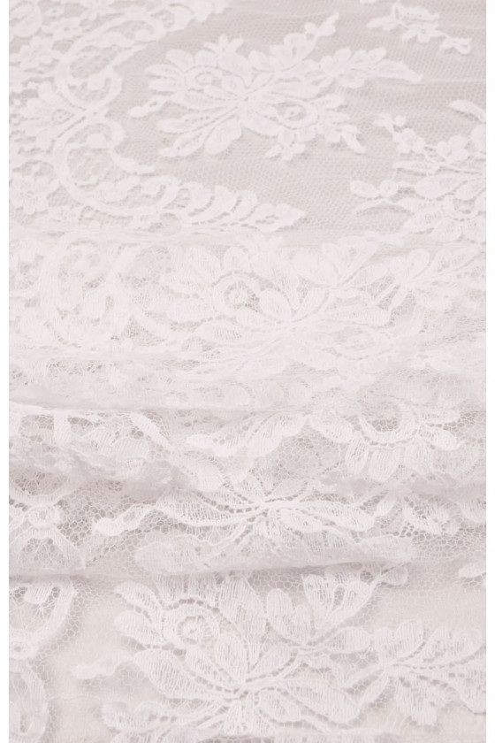 Az utolsó kupon 125cm*90cm-es esküvői csipke, klasszikus, sűrű fehér krémszínű mintával, mindkét oldalán foggal. A csipke finom, puha tapintású.