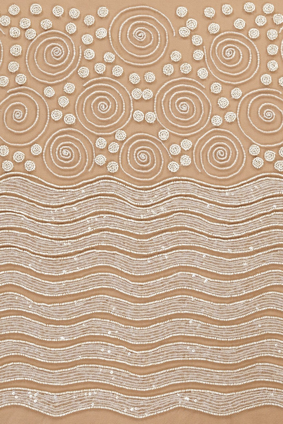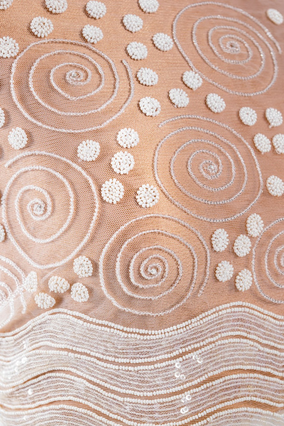 Olasz esküvői rátét fűző formájában (blúz - elülső) krémszínű. Az applikáció tetején egy gyönyörű geometriai mintás motívum (6 cm) található, amely átlátszó gyöngyökből készül, kiegészítve finomabb pöttyökkel (1,5 cm) gyöngy színben, az alsó hullámmotívummal (1,8 cm), átlátszó flitterekkel töltve és gyöngygyöngyökkel körülvéve. Az egészet puha tüllre varrják.