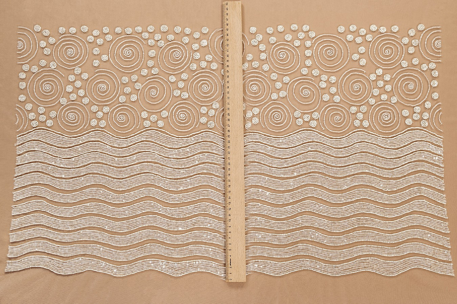 Olasz esküvői rátét fűző formájában (blúz - elülső) krémszínű. Az applikáció tetején egy gyönyörű geometriai mintás motívum (6 cm) található, amely átlátszó gyöngyökből készül, kiegészítve finomabb pöttyökkel (1,5 cm) gyöngy színben, az alsó hullámmotívummal (1,8 cm), átlátszó flitterekkel töltve és gyöngygyöngyökkel körülvéve. Az egészet puha tüllre varrják. Gyönyörű dekoráció esküvői vagy estélyi ruhához.