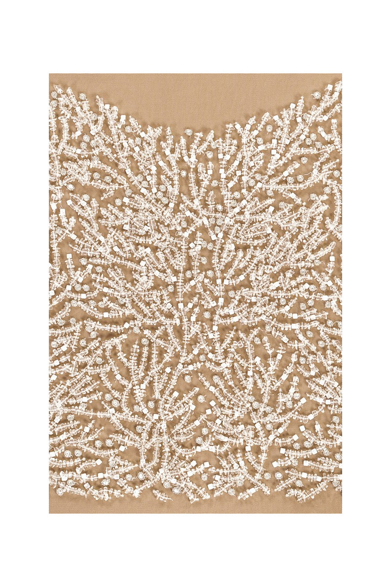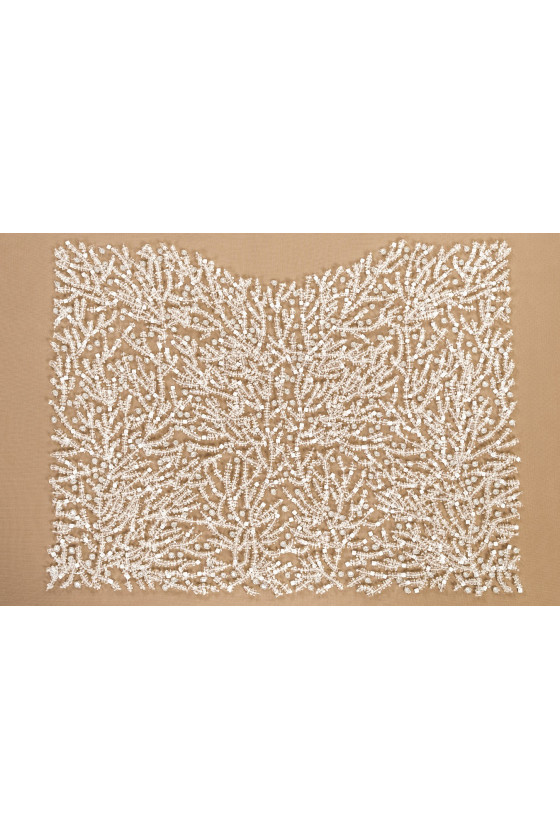 Az esküvői rátét, tejszerű kövekkel és lurex hímzéssel ellátott ekrüből készült rátét az elülső és két hátsó részből áll. Az egyes elemek méretei az alábbi táblázatban találhatók. Esküvői ruhákhoz vagy fűzőkhöz, blúzokhoz szánt készlet.