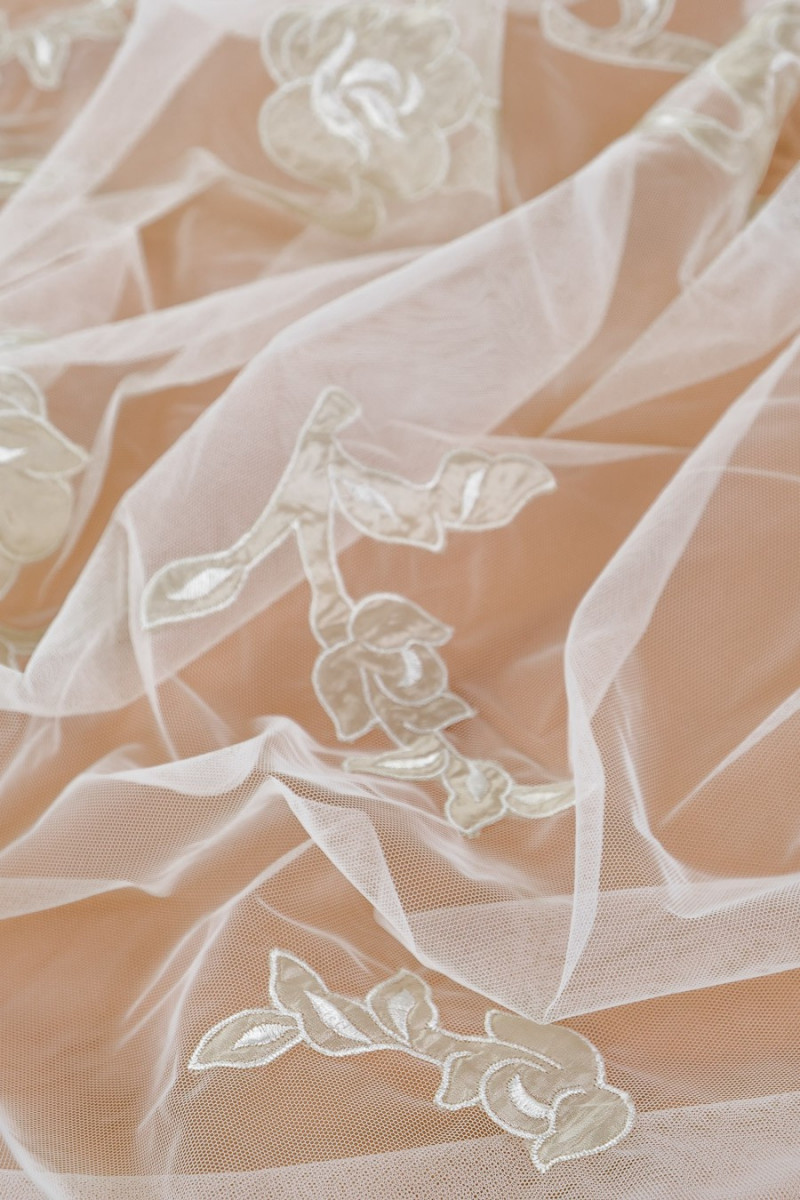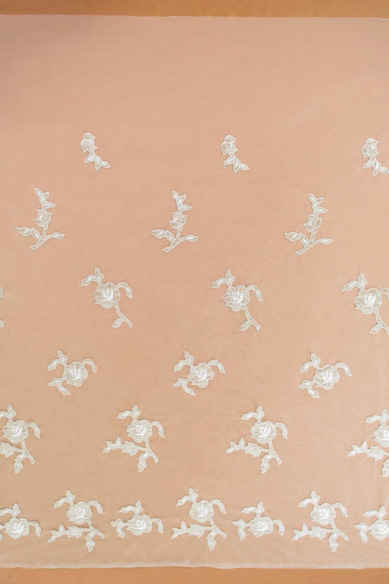 Esküvői csipke varrott szatén virág rátétekkel 15-20 cm ecru színben. A koronát nem díszítő foggal fejezik be. A virágok kivághatók és varrhatók egy másik anyagra. Az anyag tökéletes esküvői ruha vagy elegáns blúz varrásához.