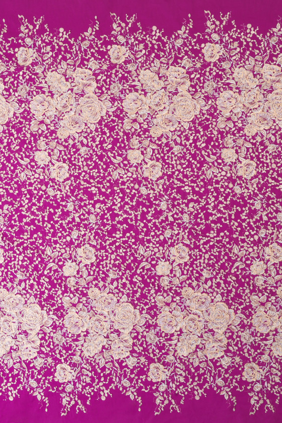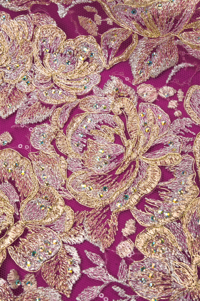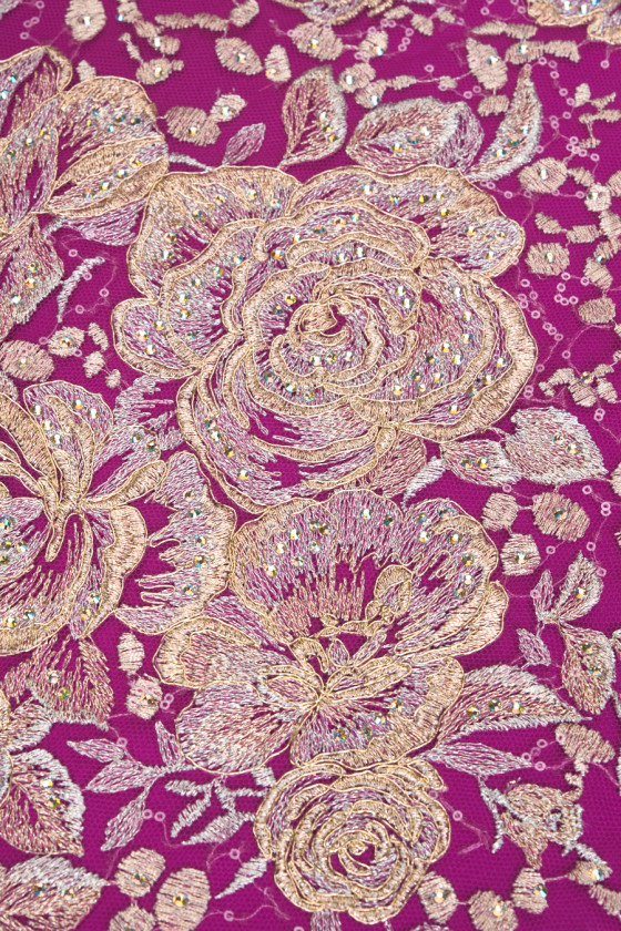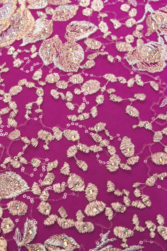 Olasz merev tüll klasszikus rózsaszín fűzőlyukakkal, hímzett arany színű rózsákkal és kis arany levelekkel, gazdagon díszített irizáló kövekkel és kis átlátszó flitterekkel. A hímzés a két szél felé sűrűsödik, ezért javasoljuk a varrást a kerület körül. A szövet nagyon hatékony, átlátszó (bélést igényel), nem rugalmas és könnyű. A szövetre helyezett kövek gyönyörűen ragyognak, és exkluzív megjelenést kölcsönöznek az anyagnak. Fantasztikus javaslat estélyi ruha, szoknya vagy blúz varrására egy nagyon érdekes kiadásban.