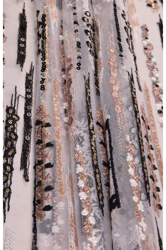 Fehér tüll hímzett fekete, fehér és lazacszál. A hímzésre kis flittereket varrnak. A tüll egy irányba nyúlik. Nagyon lenyűgöző anyag, eredeti formális ruhák varrására használható.