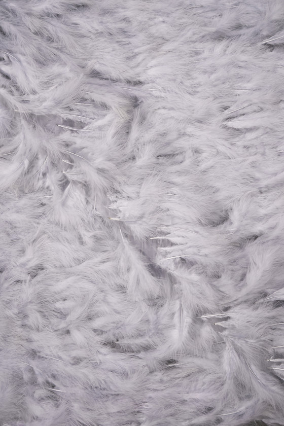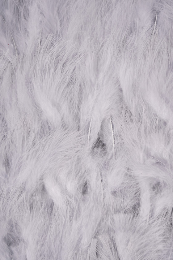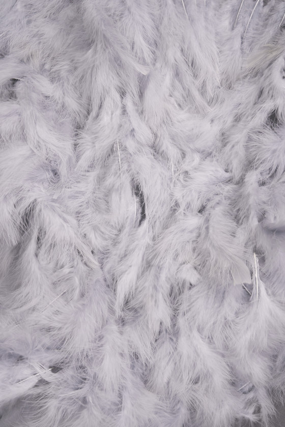 Fenomenális estélyi szövet szürke színben - a hálót sűrűn vágják kb. 15 cm hosszú kakastollal - kerületileg varrjuk. Az anyag enyhén átlátszó, 115 cm széles, a tollak puhaak és bolyhosak.