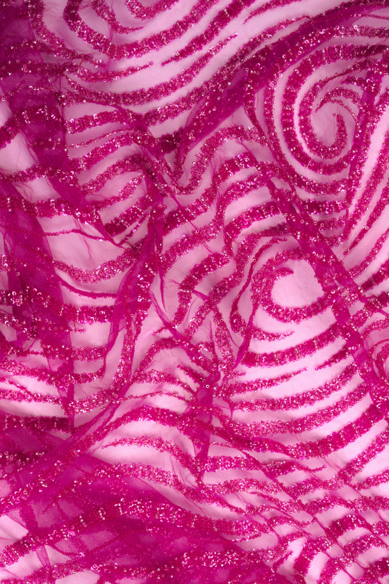 Olasz esti szövet fuksziában. Az azonos színű merev tüll gazdagon díszített gyöngyökkel és flitterekkel, amelyek hullámok formájában vannak elrendezve. A szövet egyik széle felé sűrűsödnek - körkörösen varrjuk. Fantasztikus ajánlat estélyi ruha varrására a legdivatosabb színben. Szövet azok számára, akik követik a legújabb divatirányzatokat.