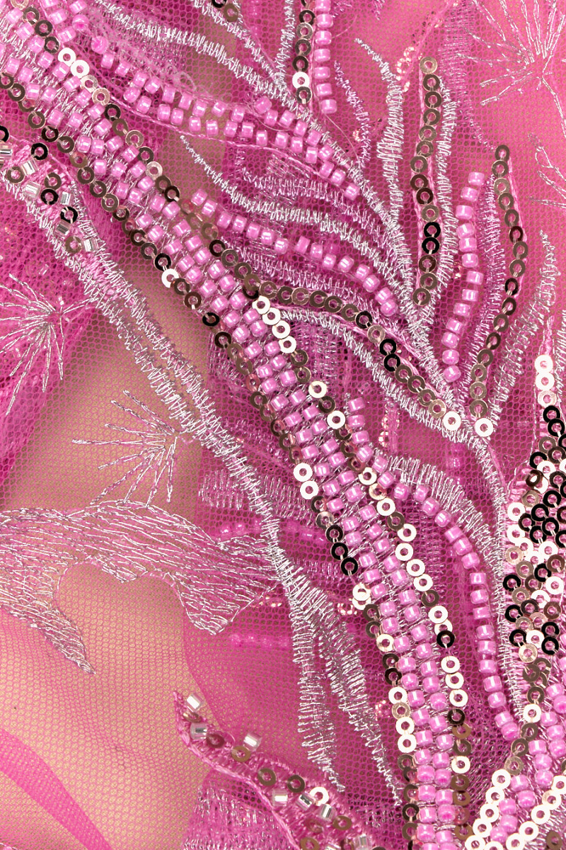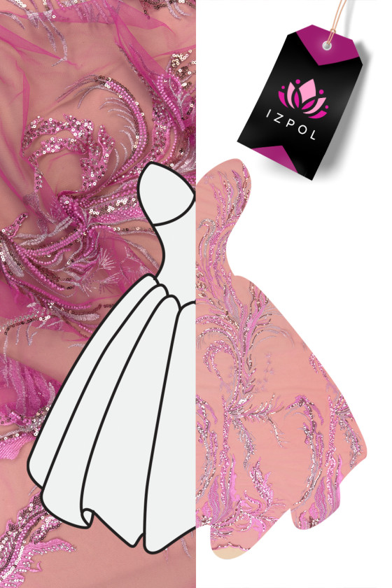 Olasz esti szövet rózsaszínben. Merev tüll ugyanolyan színű, rózsaszín és ezüst hímzéssel, gazdagon díszített arany flitterekkel és kis rózsaszín és ezüst gyöngyökkel. Ezek egy díszes mintában vannak elrendezve, amely az egyik él felé sűrűsödik - az anyagot kerületileg varrják. A szövet mindkét oldalán dekoratív foggal van ellátva. Nagyszerű ajánlat a legdivatosabb színben több évszakra. Tökéletes elegáns ruha, szoknya vagy blúz varrásához.