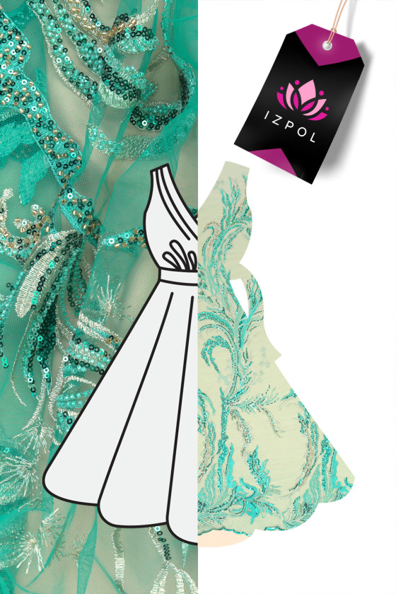 Olasz estélyi szövet türkizkék színben. Merev tüll ugyanabban a színben, türkiz és ezüst hímzéssel, gazdagon díszítve türkiz flitterekkel és kicsi, türkiz és arany gyöngyökkel. Díszes mintázatban vannak elrendezve, amely az egyik széle felé megvastagodik - a szövet kerületileg van varrva. A szövet mindkét oldalán dekoratív foggal van ellátva. Nagyszerű ajánlat a legdivatosabb színben több évszakra. Tökéletes elegáns ruha, szoknya vagy blúz varrásához.