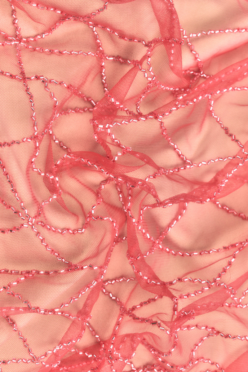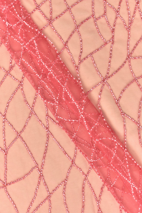 Olasz merev tüll klasszikus korall fülekkel. Finoman díszített azonos színű hengeres gyöngyökkel. Gyémántszerű geometriai mintát alkotnak, amely a szövet egyik széle felé sűrűsödik (nincs dekoratív felület). A szövet nagyon hatékony, átlátszó (bélést igényel), nehéz, enyhén rugalmas - körkörösen varrjuk. Fantasztikus javaslat estélyi ruha, szoknya vagy blúz varrására egy nagyon érdekes kiadásban.