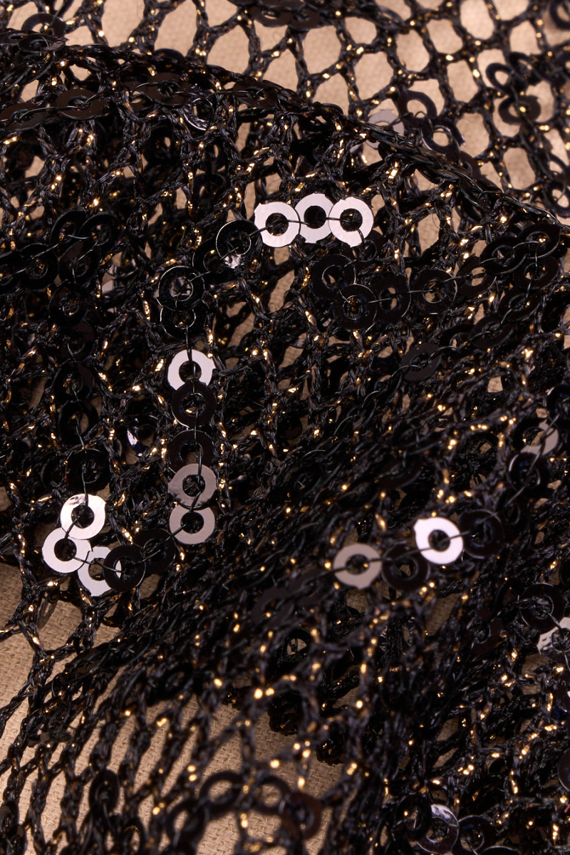 Olasz hálós szövet fekete színben, kis, fekete, szabálytalanul elhelyezett flitterekkel és arany, fényes cérnával díszítve. A szövet könnyű, puha, átlátszó és enyhén rugalmas - szálakon működik. Nagyon lenyűgöző javaslat, amely tökéletes ruhákhoz, szoknyákhoz, blúzokhoz.