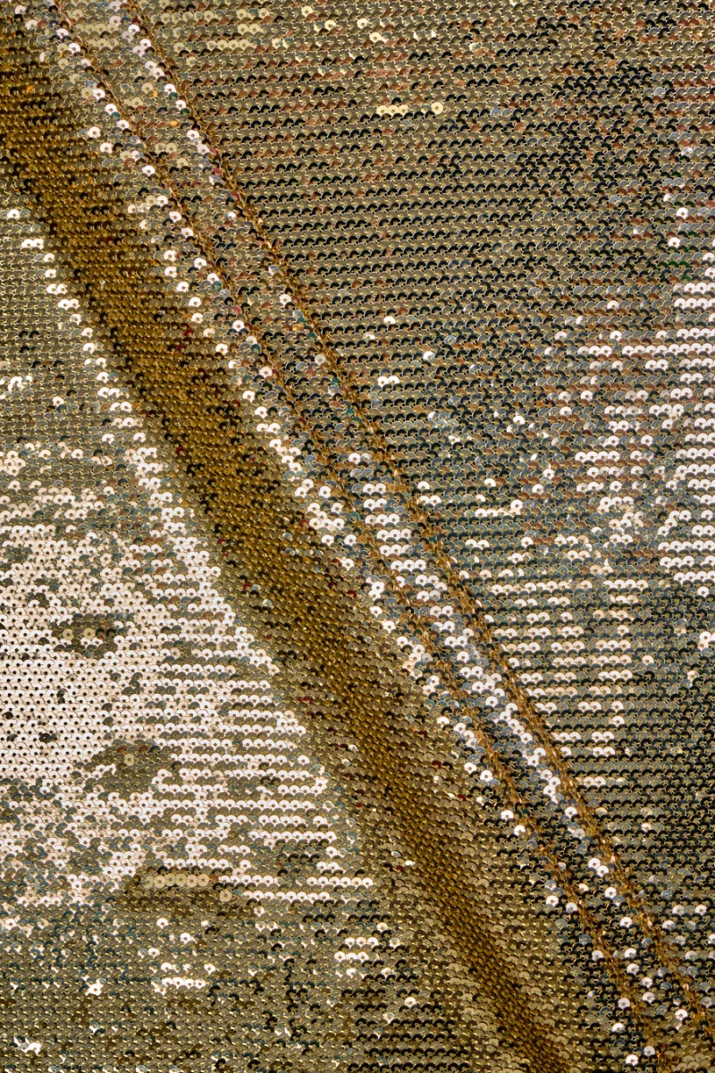 Exkluzív flitteres szövet arany színben. Sűrűn és szabályosan elrendezve 5 mm-es flitterekben, amelyek erősen visszaverik a fényt, csodálatos fényes hatást keltve. 170 cm széles bézs rugalmas hálóra varrt flitterek, 145 cm szélességű flitterek. Fantasztikus ajánlat estélyi ruha, szoknya vagy blúz varrására káprázatos kiadásban.