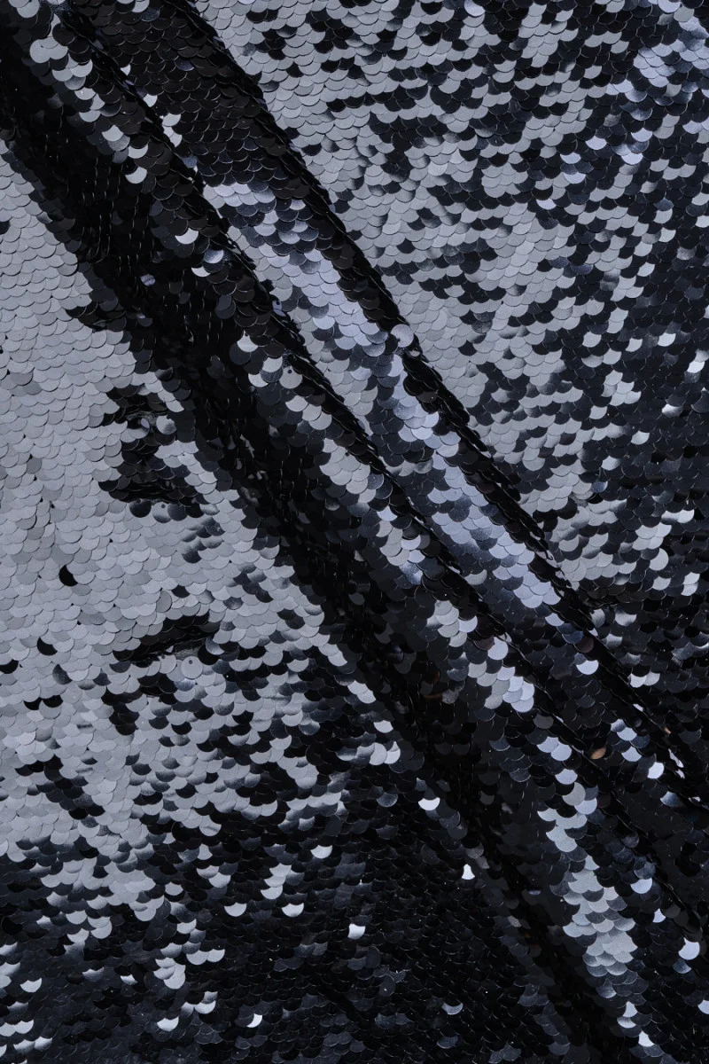 Exkluzív flitteres szövet sötét sötétkék színben. Sűrűn és rendszeresen halmérlegek, 8 mm méretű flitterek formájában helyezkednek el, amelyek gyönyörűen tükrözik a fényt, csodálatos fényes hatást eredményezve. 155 cm széles sötétkék rugalmas hálóra varrt flitterek, 130 cm szélességű flitterek. Fantasztikus ajánlat estélyi ruha, szoknya vagy blúz varrására káprázatos kiadásban.
