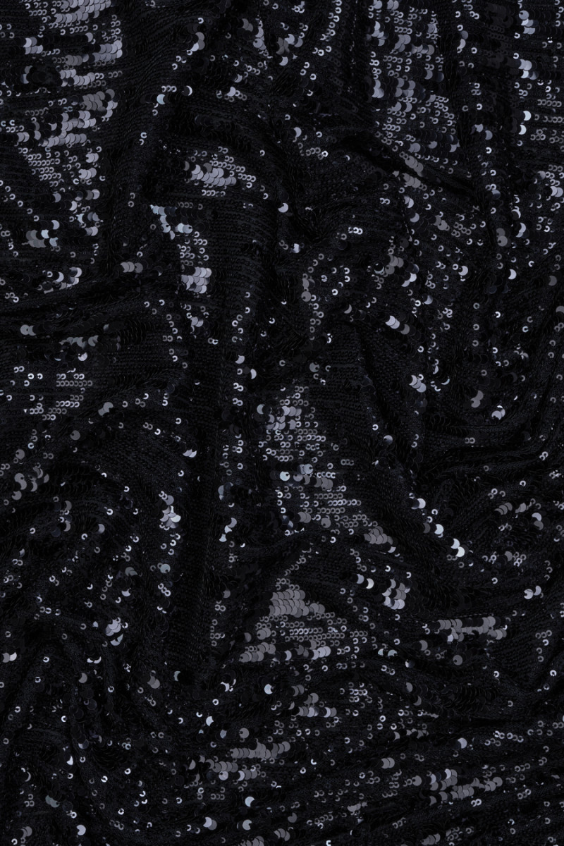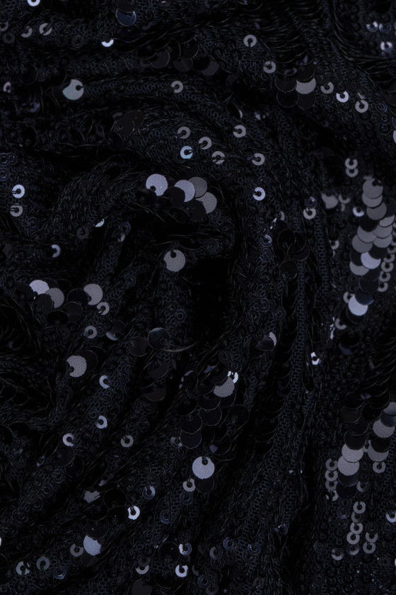 Exkluzív flitteres szövet fekete, sötétkék és arany színekben. Két méretű flitter normál sorokban elhelyezve - kerületi varrást rendelünk. 160 cm széles rugalmas hálóra varrt flitterek, 130 cm szélességű flitterek. Az arany flitterek fehérben vannak a rácson, a többi flitterben. A szövet rugalmas, enyhén átlátszó, puha és könnyű. Nagyszerű javaslat estélyi ruha, szoknya, blúz varrására.