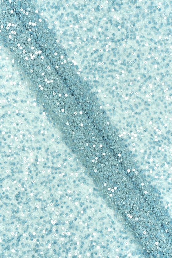 Olasz szövet háló formájában, szabálytalan fűzőlyukakkal, kék színben, gazdagon díszítve gyöngyökkel és flitterekkel, azonos színű. Az anyag átlátszó (bélést igényel), meglehetősen nehéz, enyhén rugalmas, a gyöngyök és flitterek gyönyörűen ragyognak. Fantasztikus és nagyon hatékony ajánlat estélyi ruha, szoknya vagy blúz varrásához.
