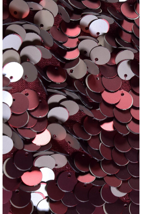 Gyönyörű flitterek hímzettek viszkóz kötöttárura. Stretch szövet. A flitterek forognak. Az egyik oldalon cseresznye színűek, a másik oldalon bézs. Tökéletes ruhákhoz, blúzokhoz, szoknyákhoz.