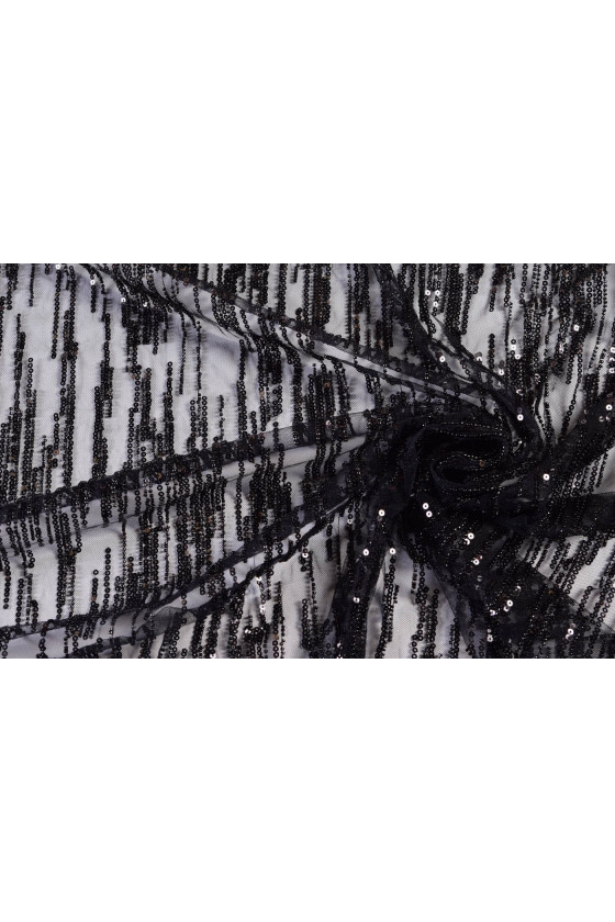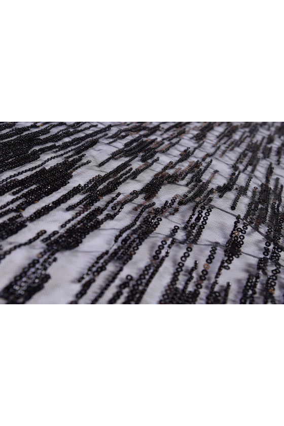 Fenomenális szövet fekete estélyi ruhákhoz. Hímzett gyöngyök, flitterek. A szövet varrható fekete bélésre és például meztelen színre is