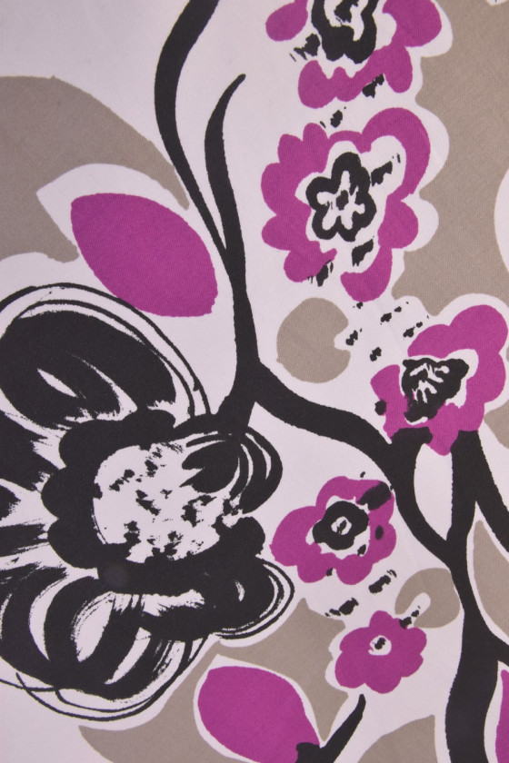 Nyomtatott pamut, rugalmas, vastagabb, nagy, festett virágmintával. Színek: virágok lila, fekete és olíva bézs színben az ecru-n.