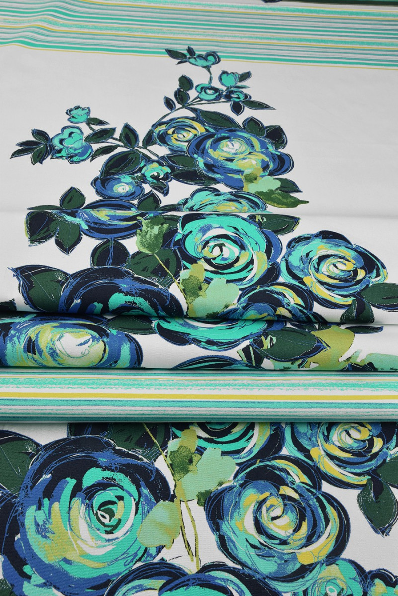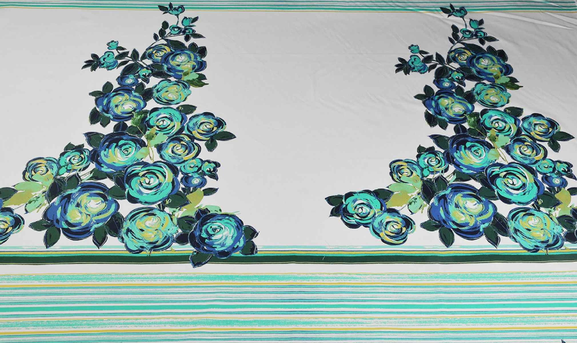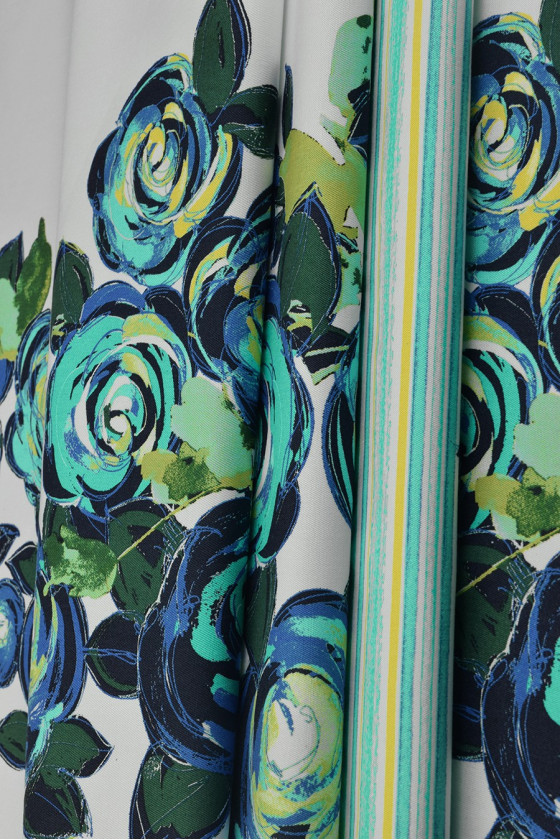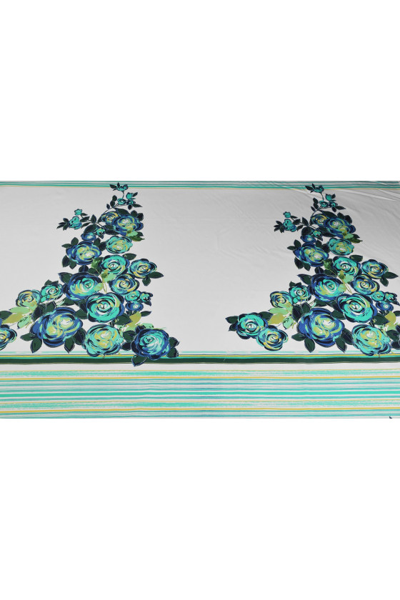 Rugalmas pamut, fehér alapon zöld és sötétkék virágokkal nyomtatva. A kupon alján és tetején zöld és sárga csíkok vannak. A teljes virágminta körülbelül 70 cm hosszú. Javaslat tunikák, blúzok, ruhák varrására