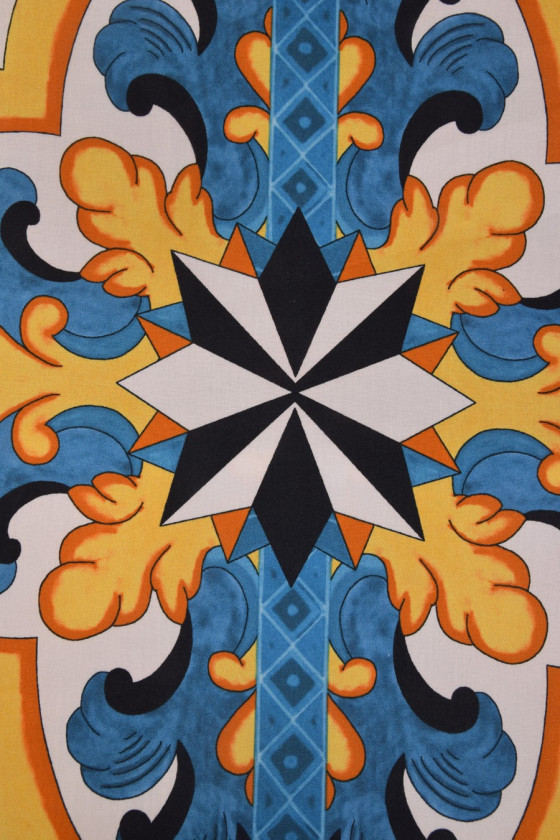 Olasz pamut szövet kupon méretben 130cm * 140cm. Nagyon érdekes, keleti minta fekete, sárga és kék színben.
