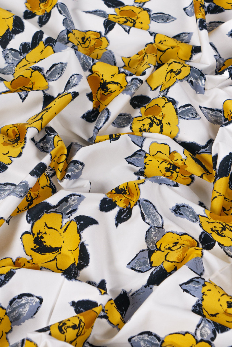 Olasz pamutszövet, sárga és fekete virágok motívumával, fehér alapon. Vastagabb, enyhén merev, rugalmas anyag - tökéletes ruha, szoknya, nadrág varrásához.