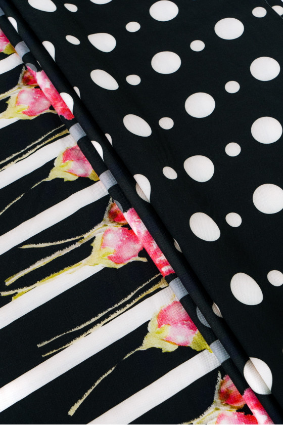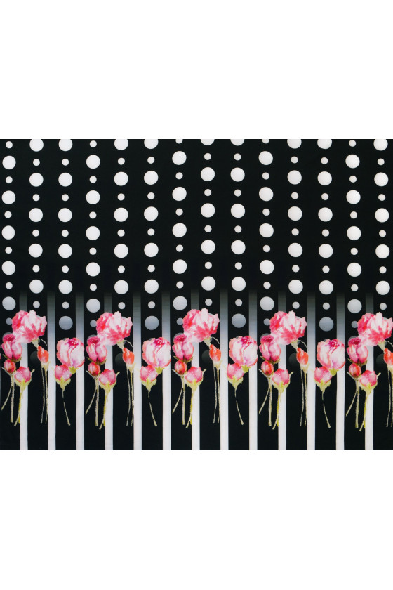 Olasz pamut 110 cm* 150 cm méretű kuponban. Nagyon érdekes jacquard szövésű szövet. A kupon felső részén nagy pöttyös motívum (4,5 cm és 2 cm), az alsó rész szürke és fekete csíkokra festett rózsák. Rugalmas, enyhén merev, matt anyag - tökéletes ruha vagy szoknya varrásához.