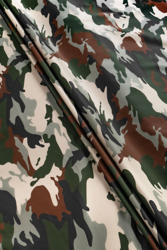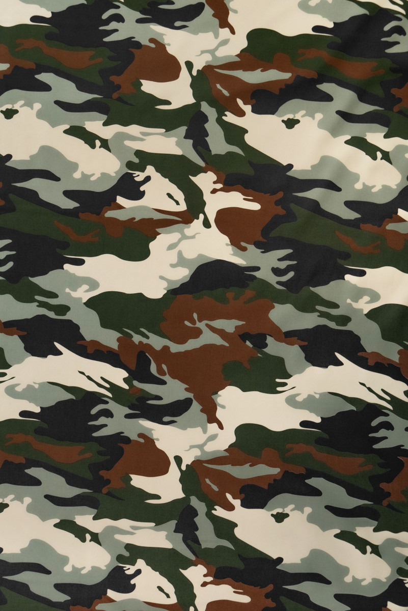 Olasz pamutszövet álcázott motívummal. A pamut 100% -ban természetes rost. A pamutszövetek tartósak, nem kopnak gyorsan, hosszú ideig megőrzik tulajdonságaikat, tökéletesen lélegzőek, lélegzőek, ami magas kényelmet biztosít. Vékonyabb, rugalmasabb, enyhén merev anyag, ingekhez, ruhákhoz vagy szoknyákhoz.