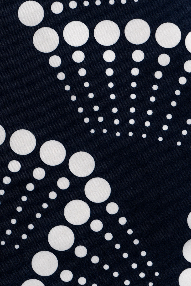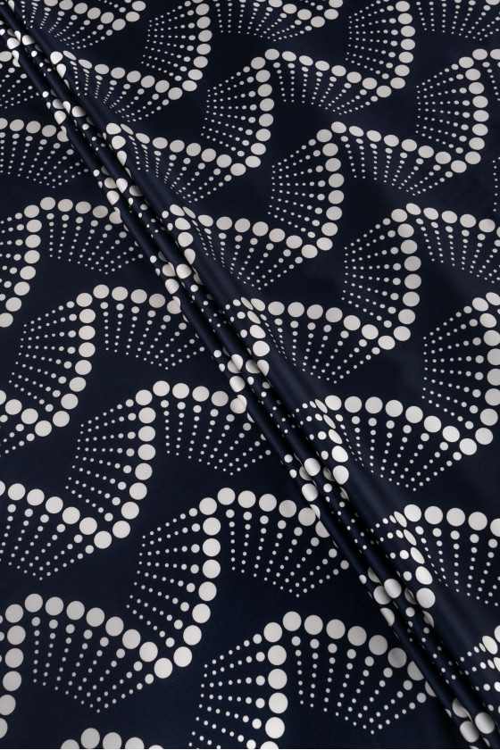 Olasz pamut elasztikus, sötét sötétkék színben, szabálytalan pöttyök motívumával, krémszínben. A pamut 100% -ban természetes rost.