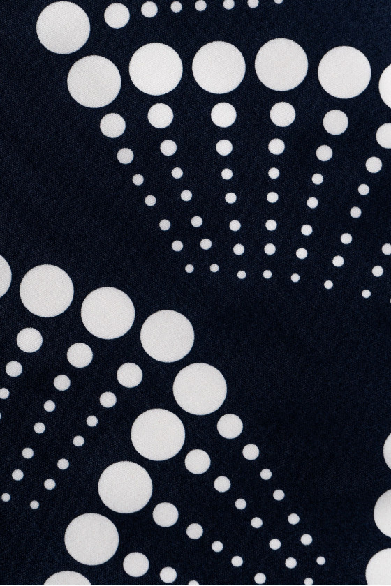Olasz pamut elasztikus, sötét sötétkék színben, szabálytalan pöttyök motívumával, krémszínben. A pamut 100% -ban természetes rost. A pamutszövetek tartósak, nem kopnak gyorsan, hosszú ideig megőrzik tulajdonságaikat, tökéletesen lélegzőek, lélegzőek, ami magas kényelmet biztosít. Enyhén rugalmas, matt, átlátszatlan anyag - tökéletes ruha, nadrág, szoknya vagy rövidnadrág varrásához.