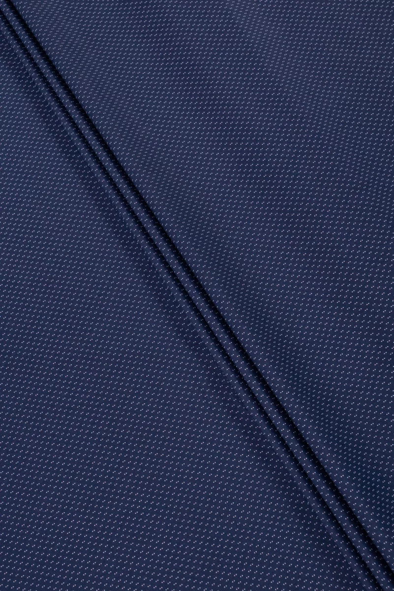 Olasz ing pamut sötétkék színben, egy kicsi, fehér és piros motívummal, amely egy "fűzőlyukra" emlékeztet. Az anyag vékony, de átlátszatlan, nem rugalmas. Kupon méretei 85cm* 150cm.