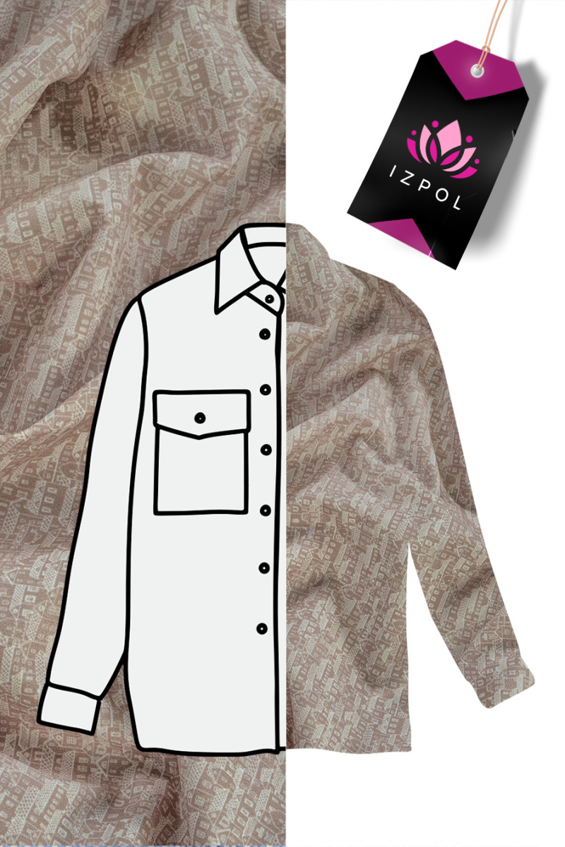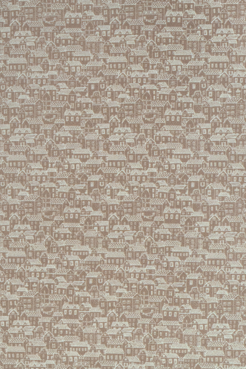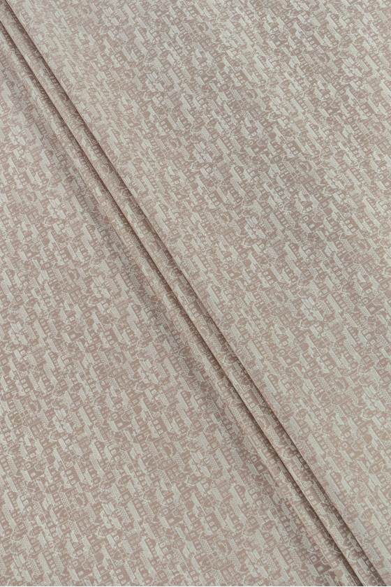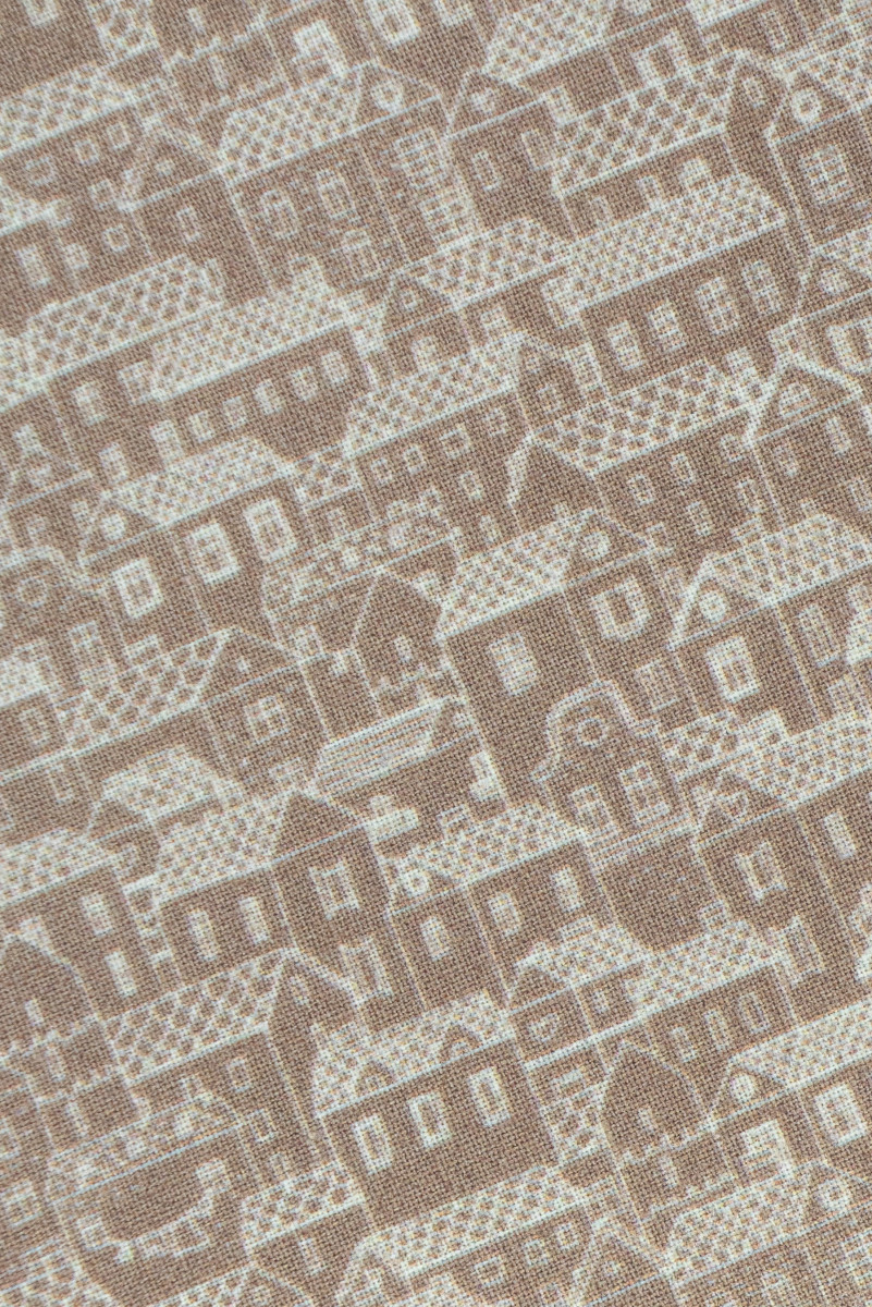 Olasz ing pamut bézs színben, kis házak motívumával. Nem rugalmas szövet szatén szövésű, átlátszatlan, kis gyűrődéssel.