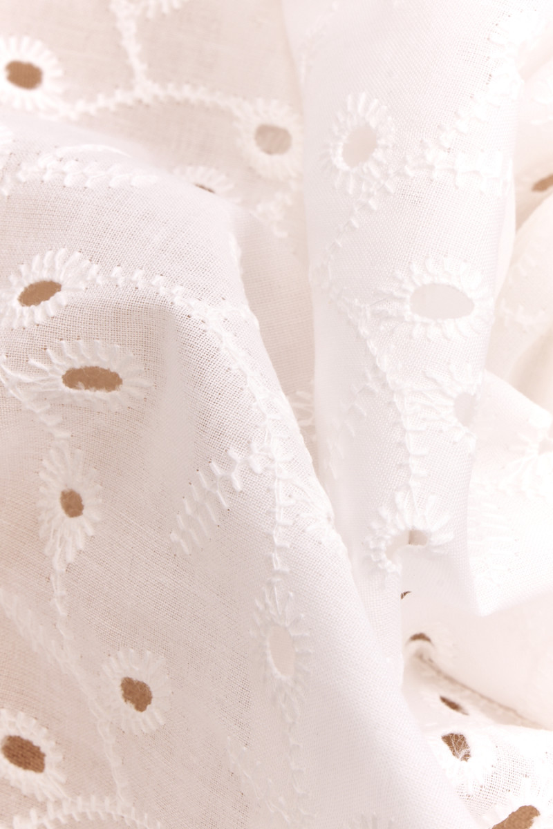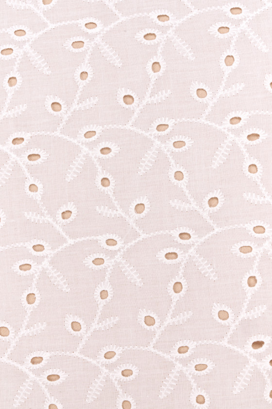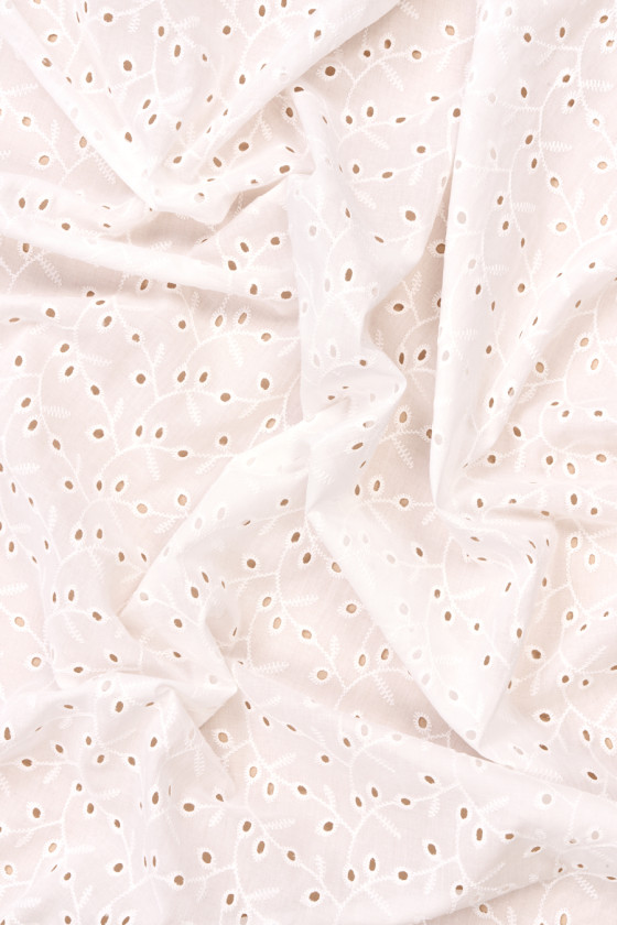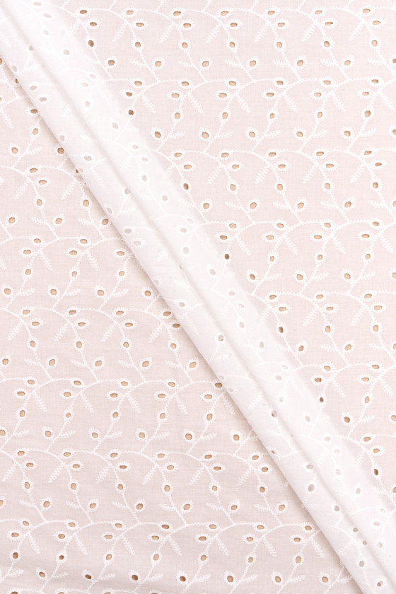Olasz 100% pamutszövet fehér Richelieu hímzéssel. A gallyakba rendezett apró virágok motívuma, a minta rendszeres és sűrű. A szövet vékony, kissé átlátszó, nem rugalmas, mindkét széle szépen elkészült. Csodálatos, könnyű ajánlat blúzokhoz, ingekhez és ruhákhoz.