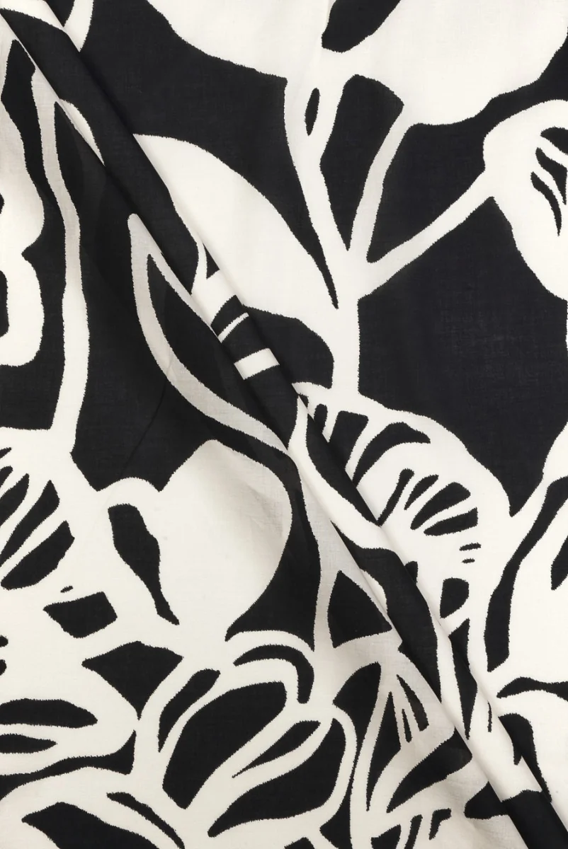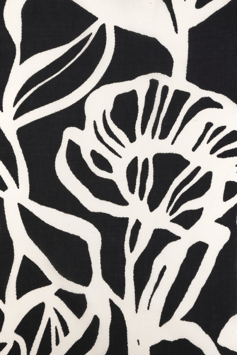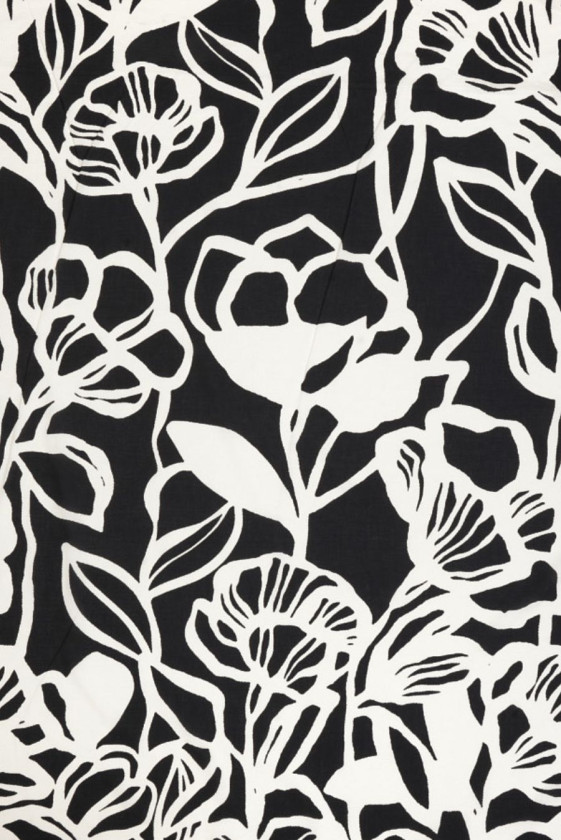 Olasz 100% pamutszövet nagyon nagy virágok motívumával, ekrüből, fekete alapon. Virágminták, amelyek meglehetősen sűrűn helyezkednek el virágrügyek, szárak és levelek körvonalai formájában, ahol az egyes virágok mérete 21 cm és 35 cm között van. A minta helyzetéből adódóan kerületi varrást javasolunk. Sima szövésű, vékony, enyhén átlátszó, szellős és nem rugalmas szövet. Tökéletes hosszú ruhákhoz és szoknyákhoz, valamint blúzokhoz, pólókhoz és ingekhez.