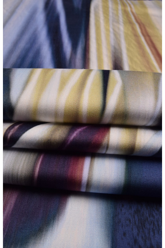 Olasz pamutszövet elasztán hozzáadásával, 115 cm * 140 cm kuponméretben. Érdekes, díszes minta a kék, bézs és bordó árnyalataiban.