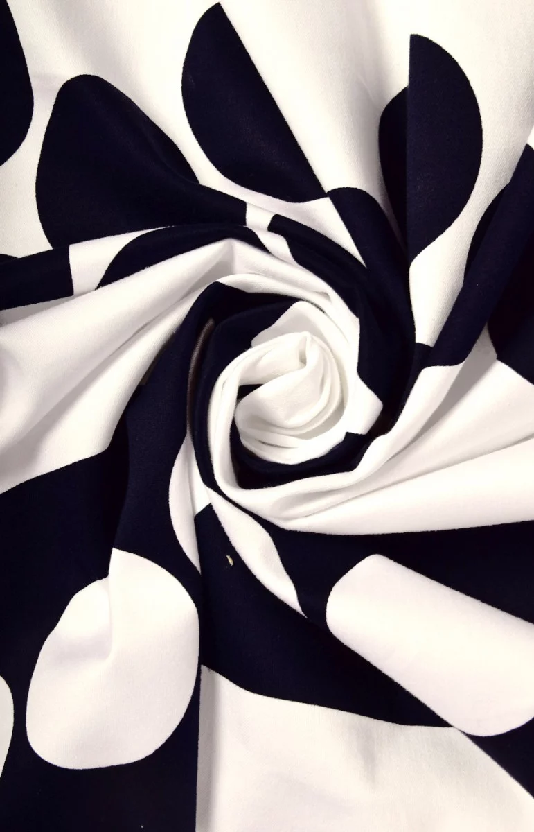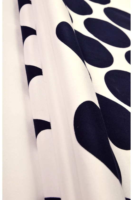 Vastagabb természetes pamut elasztánnal 150*60 cm-es kuponban, az alsó öv - fehér körök (7,5 cm) sötétkéken 14 cm. Színek: fehér és sötét sötétkék.